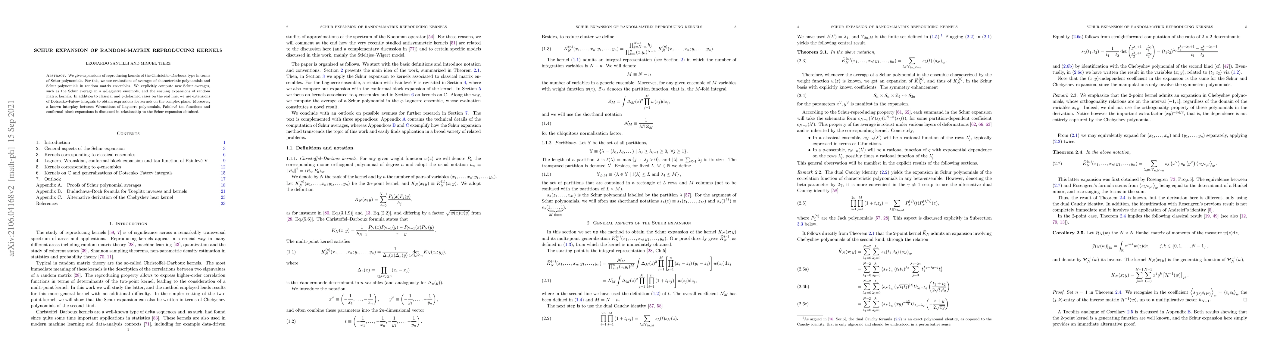 We give expansions of reproducing kernels of the Christoffel-Darboux type in terms of Schur polynomials. For this, we use evaluations of averages of characteristic polynomials and Schur polynomials in random matrix ensembles. We explicitly compute new Schur averages, such as the Schur average in a $q$-Laguerre ensemble, and the ensuing expansions of random matrix kernels. In addition to classical and $q$-deformed cases on the real line, we use extensions of Dotsenko-Fateev integrals to obtain expressions for kernels on the complex plane. Moreover, a known interplay between Wronskians of Laguerre polynomials, Painlev\'e tau functions and conformal block expansions is discussed in relationship to the Schur expansion obtained.