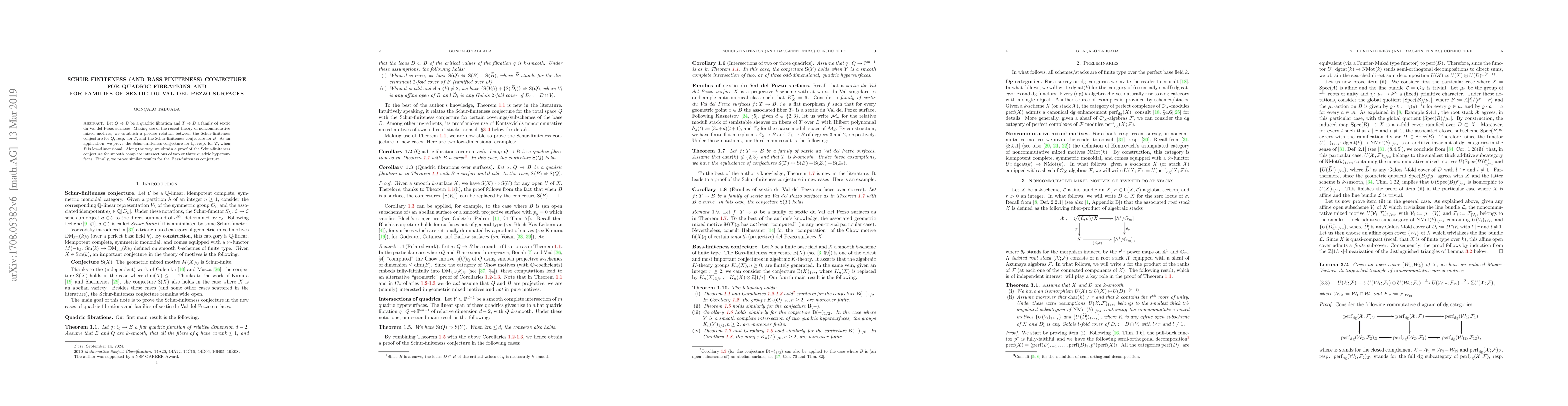 Let Q -> B be a quadric fibration and T -> B a family of sextic du Val del Pezzo surfaces. Making use of the recent theory of noncommutative mixed motives, we establish a precise relation between the Schur-finiteness conjecture for Q, resp. for T, and the Schur-finiteness conjecture for B. As an application, we prove the Schur-finiteness conjecture for Q, resp. for T, when B is low-dimensional. Along the way, we obtain a proof of the Schur-finiteness conjecture for smooth complete intersections of two or three quadric hypersurfaces. Finally, we prove similar results for the Bass-finiteness conjecture.