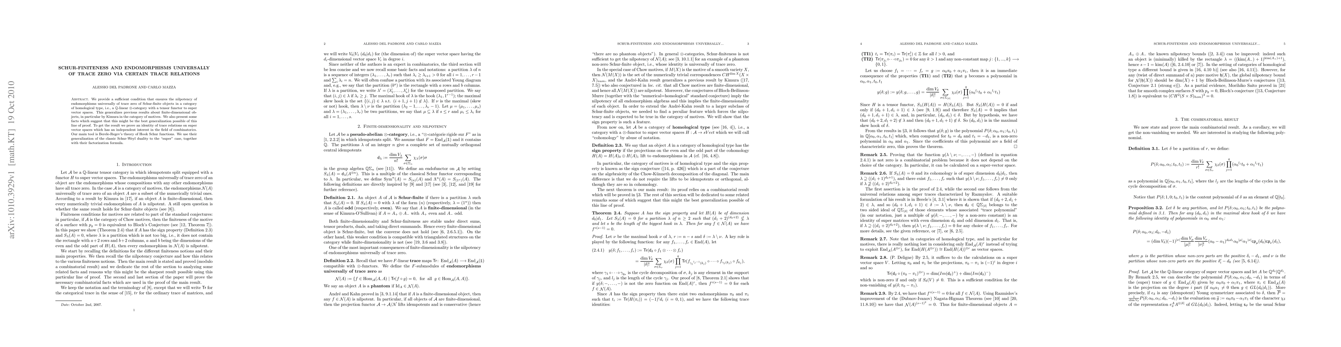 We provide a sufficient condition that ensures the nilpotency of endomorphisms universally of trace zero of Schur-finite objects in a category of homological type, i.e., a Q-linear tensor category with a tensor functor to super vector spaces. This generalizes previous results about finite-dimensional objects, in particular by Kimura in the category of motives. We also present some facts which suggest that this might be the best generalization possible of this line of proof. To get the result we prove an identity of trace relations on super vector spaces which has an independent interest in the field of combinatorics. Our main tool is Berele-Regev's theory of Hook Schur functions. We use their generalization of the classic Schur-Weyl duality to the "super" case, together with their factorization formula.