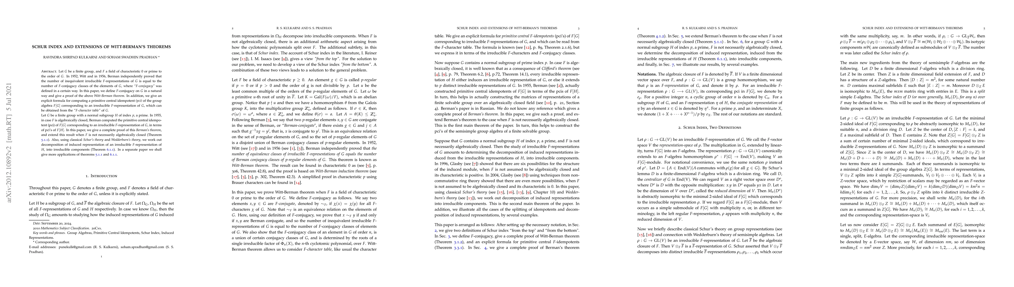 Let $G$ be a finite group, and $F$ a field of characteristic $0$ or prime to the order of $G$. In $1952$, Witt and in $1956$, Berman independently proved that the number of inequivalent irreducible $F$-representations of $G$ is equal to the number of $F$-conjugacy classes of the elements of $G$, where "$F$-conjugacy" was defined in a certain way. In this paper, we define $F$-conjugacy on $G$ in a natural way and give a proof of the above Witt-Berman theorem. In addition, we give an explicit formula for computing a primitive central idempotent (pci) of the group algebra $F[G]$ corresponding to an irreducible $F$-representation of $G$, which can be obtained from the "$F$-character table" of $G$. Let $G$ be a finite group with a normal subgroup $H$ of index $p$, a prime. In $1955$, in case $F$ is algebraically closed, Berman computed the primitive central idempotent (pci) of $F[G]$ corresponding to an irreducible $F$-representation of $G$, in terms of pci's of $F[H]$. In this paper, we give a complete proof of this Berman's theorem, and extend this result when $F$ is not necessarily algebraically closed. Also, using classical Schur's theory and Wedderburn's theory, we work out decomposition of induced representation of an irreducible $F$-representation of $H$, into irreducible components.