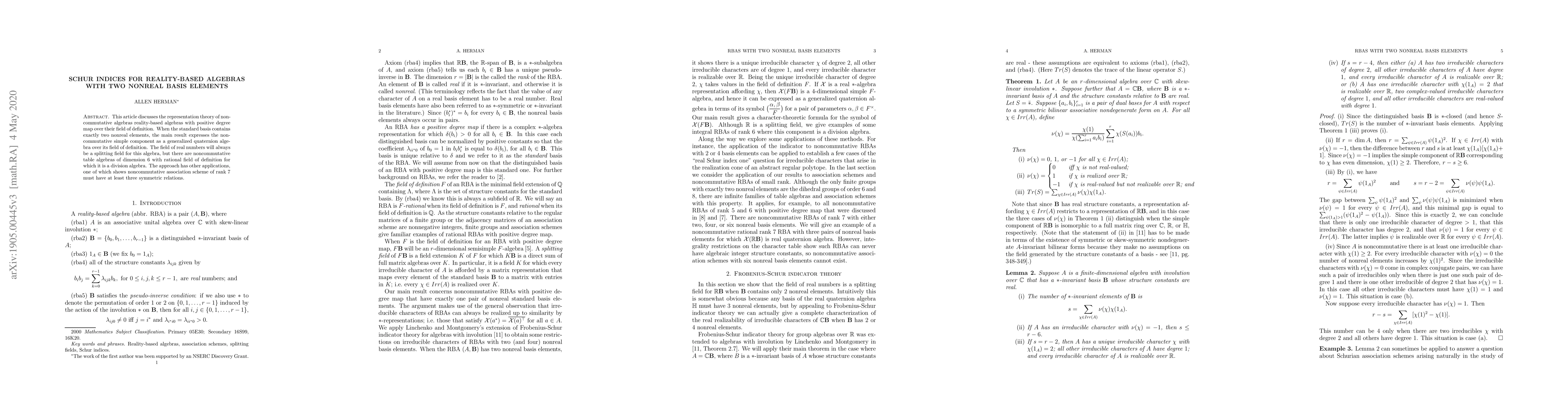 This article discusses the representation theory of noncommutative algebras reality-based algebras with positive degree map over their field of definition. When the standard basis contains exactly two nonreal elements, the main result expresses the noncommutative simple component as a generalized quaternion algebra over its field of definition. The field of real numbers will always be a splitting field for this algebra, but there are noncommutative table algebras of dimension $6$ with rational field of definition for which it is a division algebra. The approach has other applications, one of which shows noncommutative association scheme of rank $7$ must have at least three symmetric relations.