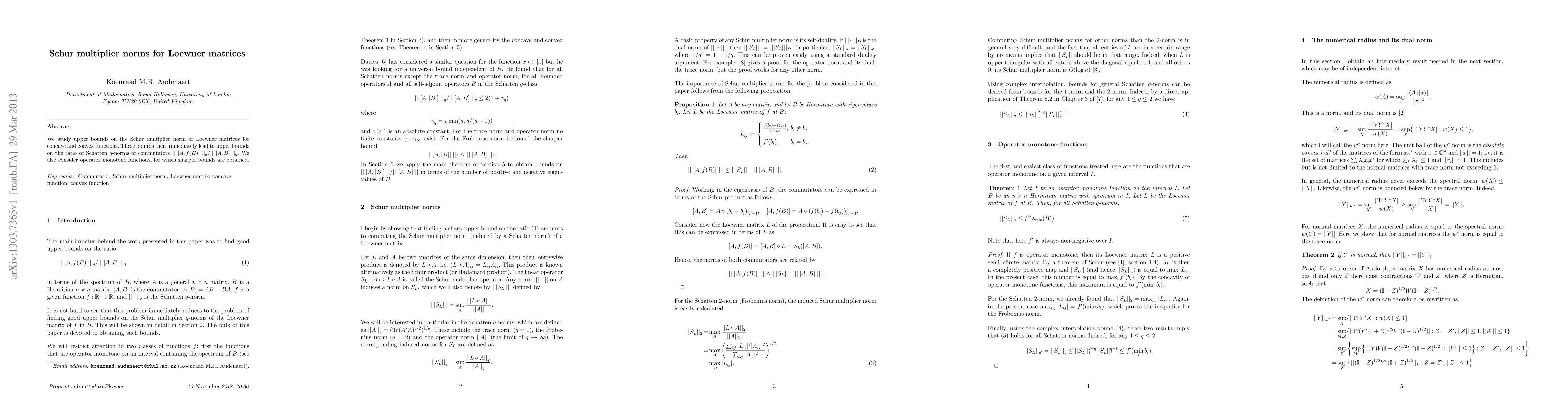 We study upper bounds on the Schur multiplier norm of Loewner matrices for concave and convex functions. These bounds then immediately lead to upper bounds on the ratio of Schatten $q$-norms of commutators $||\;[A,f(B)]\;||_q/||\;[A,B]\;||_q$. We also consider operator monotone functions, for which sharper bounds are obtained.