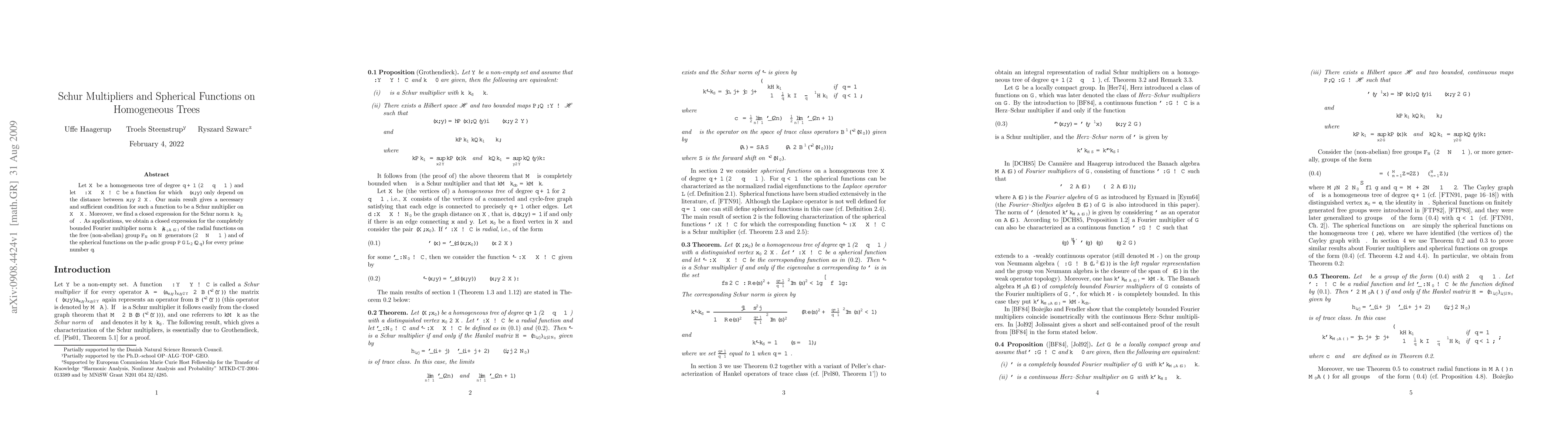 Let X be a homogeneous tree of degree q+1 (for q between 2 and infinity) and let f be a complex function on X times X for which f(x,y) only depend on the distance between x and y in X. Our main result gives a necessary and sufficient condition for such a function to be a Schur multiplier on X times X. Moreover, we find a closed expression for the Schur norm of f. As applications, we obtain a closed expression for the completely bounded Fourier multiplier norm of the radial functions on the free (non-abelian) group on N generators (for N between 2 and infinity) and of the spherical functions on the p-adic group PGL_2(Q_q) for every prime number q.