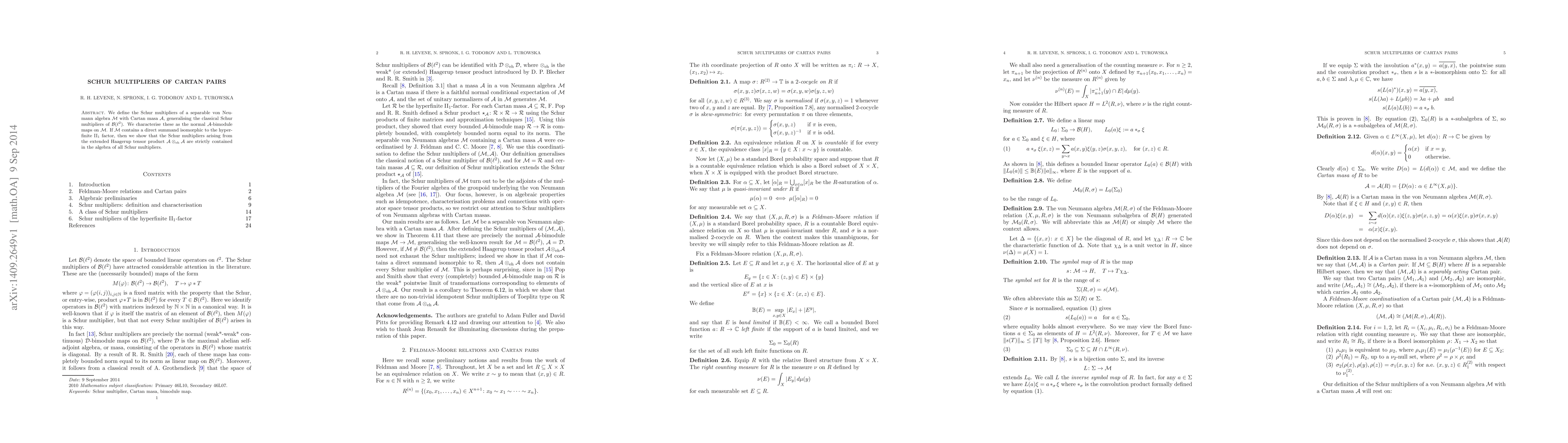 This paper defines Schur multipliers for separable von Neumann algebras with Cartan masa, generalizing the classical concept. It characterizes these multipliers as normal A-bimodule maps on M and shows that when M includes a direct summand isomorphic to the hyperfinite II_1 factor, the multipliers from the extended Haagerup tensor product are strictly contained within the full algebra of Schur multipliers.