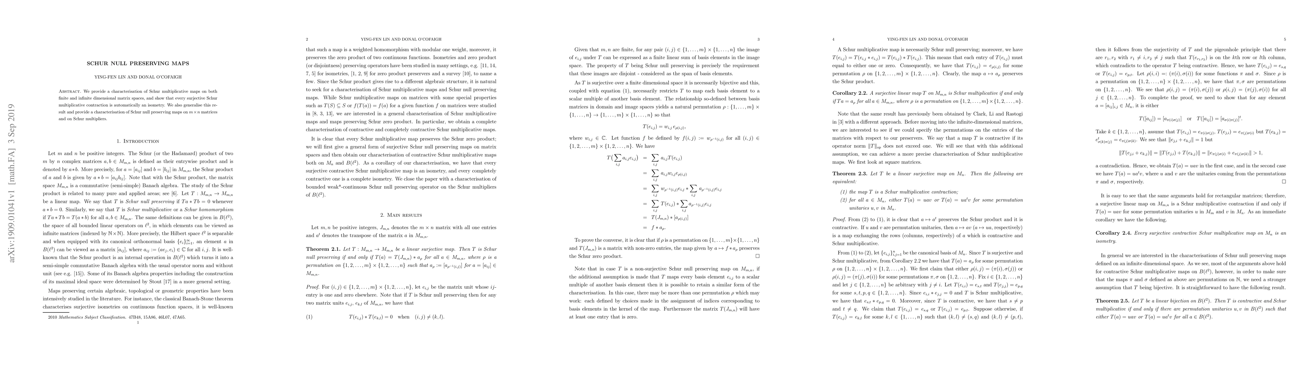 We provide a characterisation of Schur multiplicative maps on both finite and infinite dimensional matrix spaces, and show that every surjective Schur multiplicative contraction is automatically an isometry. We also generalise this result and provide a characterisation of Schur null preserving maps on $m\times n$ matrices and on Schur multipliers.