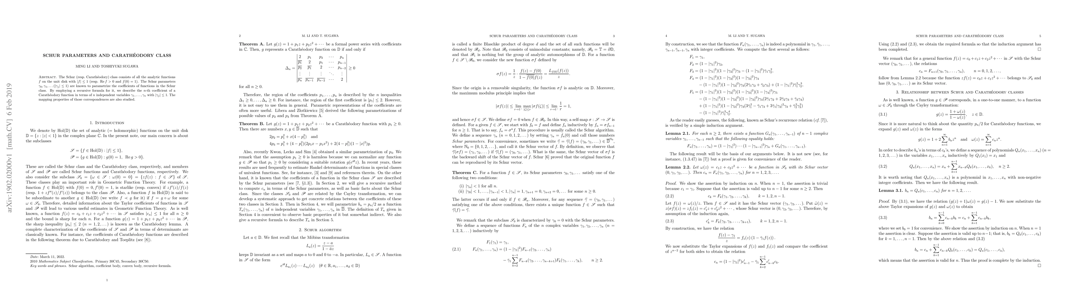 The Schur (resp. Carath\'eodory) class consists of all the analytic functions $f$ on the unit disk with $|f|\le 1$ (resp. $\Re f>0$ and $f(0)=1$). The Schur parameters $\gamma_0,\gamma_1,\dots (|\gamma_j|\le 1)$ are known to parametrize the coefficients of functions in the Schur class. By employing a recursive formula for it, we describe the $n$-th coefficient of a Carath\'eodory function in terms of $n$ independent variables $\gamma_1,\dots, \gamma_n$ with $|\gamma_j|\le 1.$ The mapping properties of those correspondences are also studied.