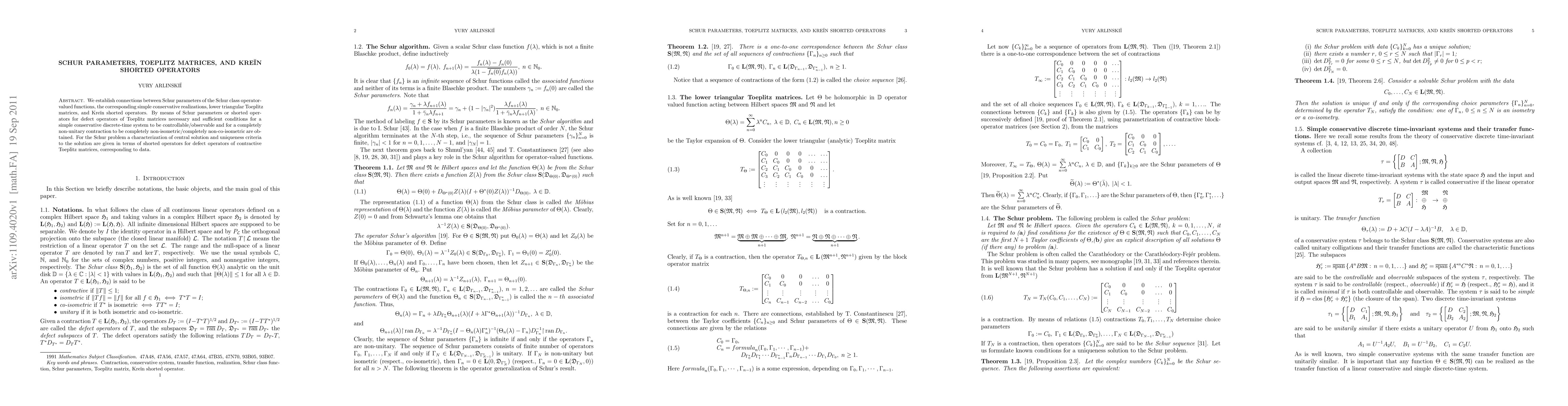 This paper explores the relationships between Schur parameters, Toeplitz matrices, and Kre\u\i n shorted operators, establishing necessary and sufficient conditions for controllability, observability, and non-isometric properties in discrete-time systems. It also provides characterizations and uniqueness criteria for the Schur problem using shorted operators for defect operators.