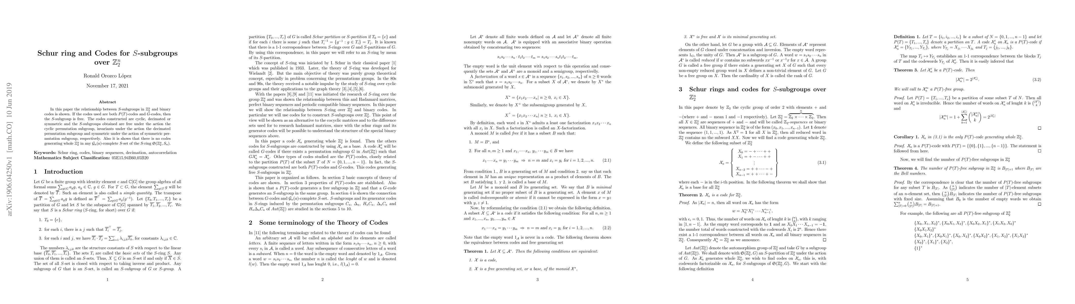This paper explores the connection between $S$-subgroups in $\Z_{2}^{n}$ and binary codes, demonstrating that $S$-subgroups are free when the codes are both $P(T)$-codes and $G$-codes. The study constructs cyclic, decimated, and symmetric codes, showing corresponding $S$-subgroups' invariance under different permutation subgroups.