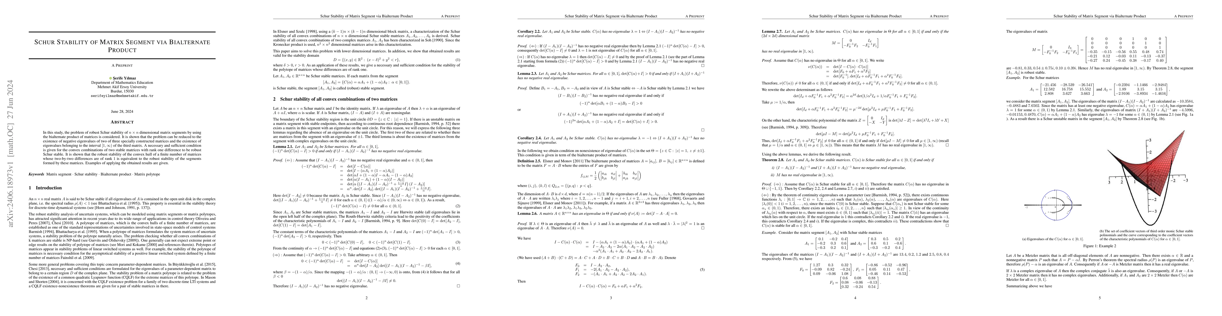 This paper explores robust Schur stability of matrix segments using the bialternate product, demonstrating that stability hinges on negative eigenvalues in two matrices and eigenvalues in $[1,\infty)$ in a third. It provides a condition for convex combinations of stable matrices with rank one difference to remain robustly Schur stable.