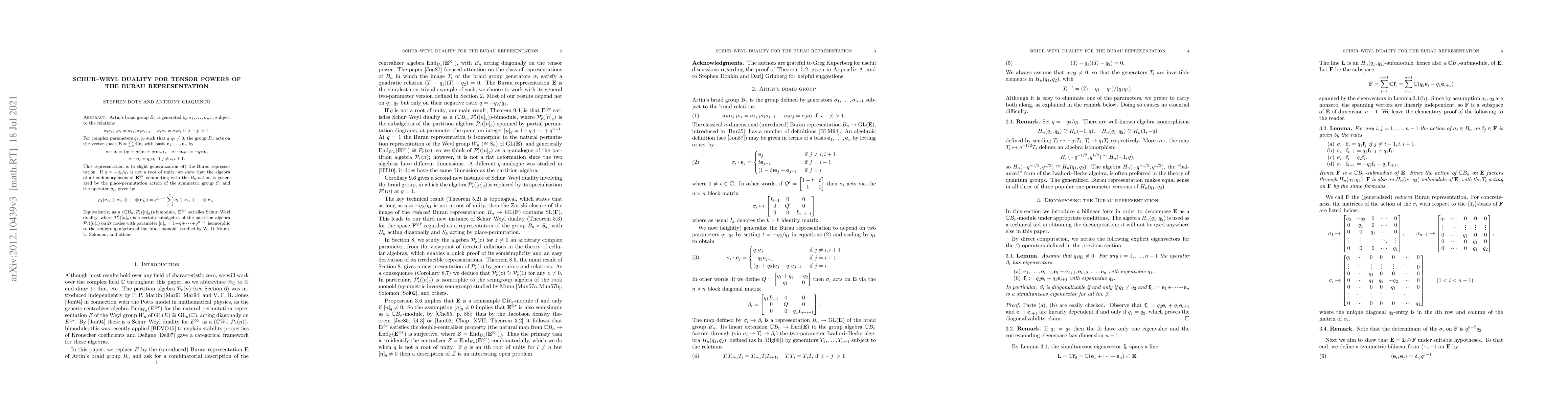 This paper explores Schur-Weyl duality for tensor powers of the Burau representation of Artin's braid group $B_n$, demonstrating that under certain conditions, the algebra of endomorphisms commuting with $B_n$ action on $\mathbf{E}^{\otimes r}$ is generated by symmetric group actions and a specific operator, establishing the duality with a subalgebra of the partition algebra.