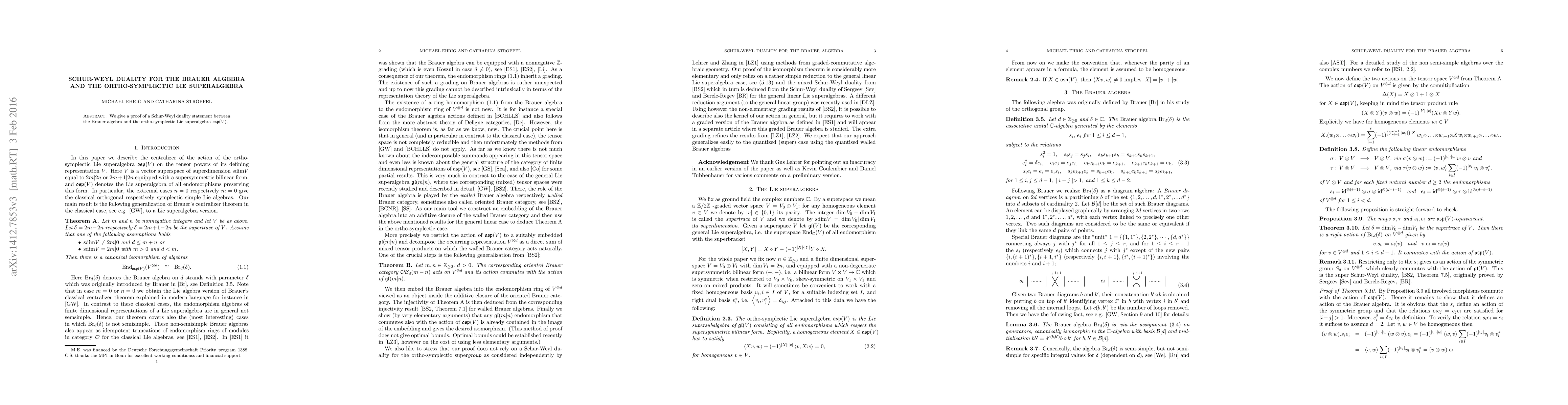 Summary: This paper proves Schur-Weyl duality between the Brauer algebra and the ortho-symplectic Lie superalgebra $\mathfrak{osp}(V)$, establishing a structural relationship between these algebraic entities.