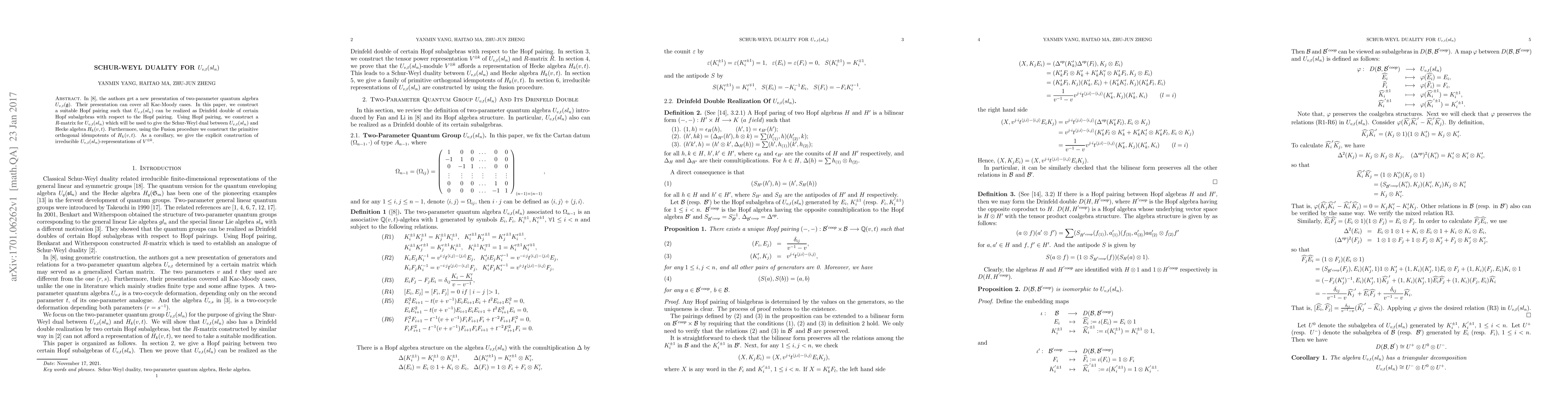 In \cite{fl}, the authors get a new presentation of two-parameter quantum algebra $U_{v,t}(\mathfrak{g})$. Their presentation can cover all Kac-Moody cases. In this paper, we construct a suitable Hopf pairing such that $U_{v,t}(sl_{n})$ can be realized as Drinfeld double of certain Hopf subalgebras with respect to the Hopf pairing. Using Hopf pairing, we construct a $R$-matrix for $U_{v,t}(sl_{n})$ which will be used to give the Schur-Weyl dual between $U_{v,t}(sl_{n})$ and Hecke algebra $H_{k}(v,t)$. Furthermore, using the Fusion procedure we construct the primitive orthogonal idempotents of $H_{k}(v,t)$. As a corollary, we give the explicit construction of irreducible $U_{v,t}(sl_{n})$-representations of $V^{\otimes k}$.