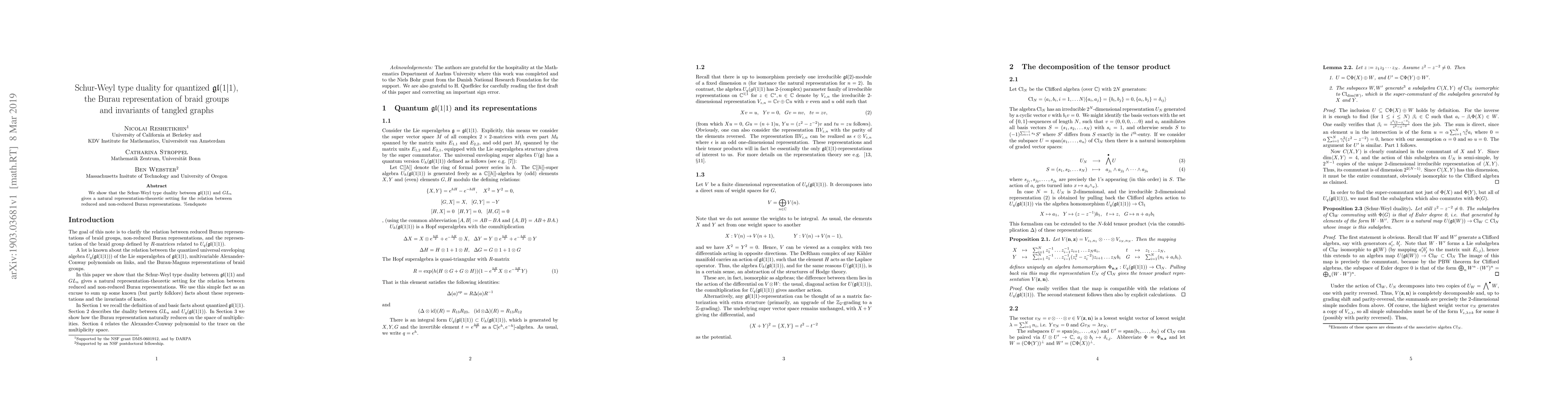 Summary: The paper establishes a Schur-Weyl type duality for $gl(1|1)$ and $GL_n$, providing a representation-theoretic framework for understanding the connection between reduced and non-reduced Burau representations, with implications for invariants of tangled graphs.
