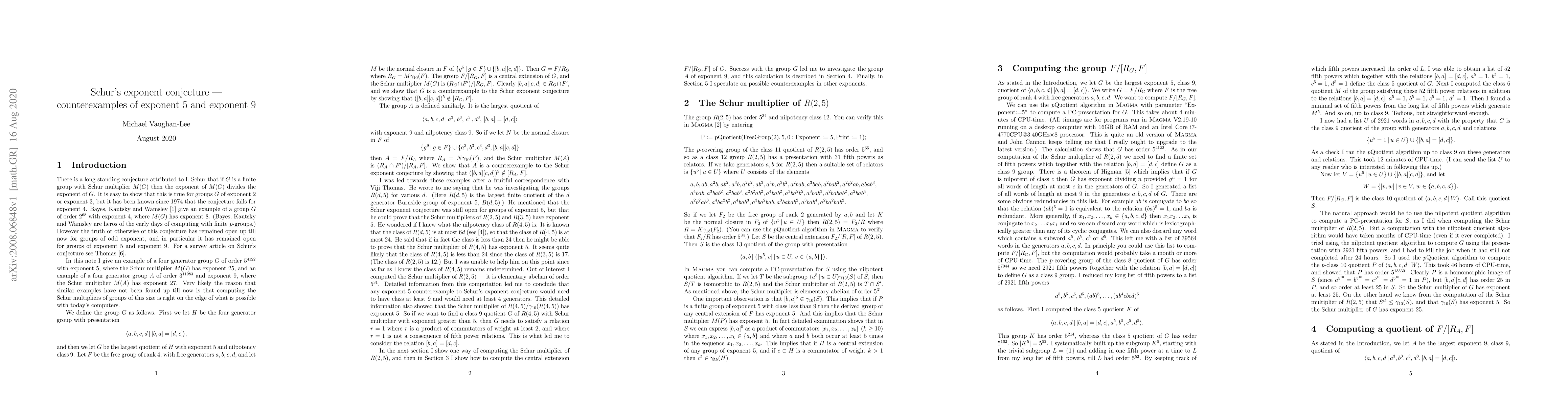 There is a long-standing conjecture attributed to I Schur that if $G$ is a finite group with Schur multiplier $M(G)$ then the exponent of $M(G)$ divides the exponent of $G$. It is easy to see that this conjecture holds for exponent 2 and exponent 3, but it has been known since 1974 that the conjecture fails for exponent 4. In this note I give an example of a group $G$ with exponent 5 with Schur multiplier $M(G)$ of exponent 25, and an example of a group $A$ of exponent 9 with Schur multiplier $M(A)$ of exponent 27.