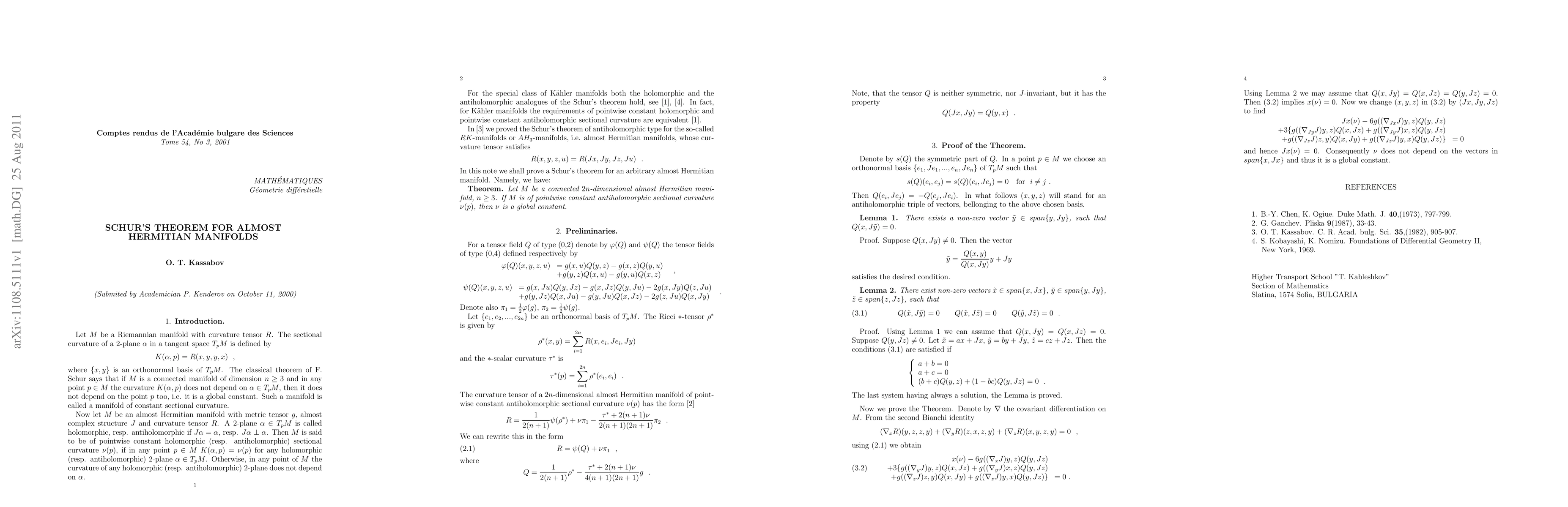 The Schur's theorem of antiholomorphic type is proved for arbitrary almost Hermitian manifolds, namely: If a connected almost Hermitian manifold of dimension greater or equal to 6 is of pointwise constant antiholomorphic sectional curvature, then this curvature is a global constant.
