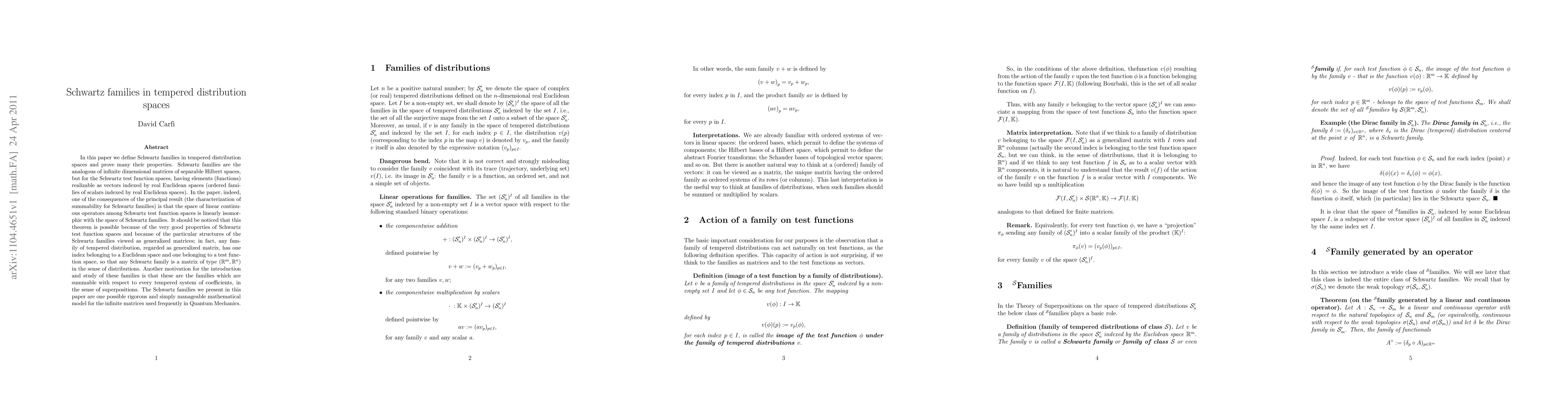 In this paper we define Schwartz families in tempered distribution spaces and prove many their properties. Schwartz families are the analogous of infinite dimensional matrices of separable Hilbert spaces, but for the Schwartz test function spaces, having elements (functions) realizable as vectors indexed by real Euclidean spaces (ordered families of scalars indexed by real Euclidean spaces). In the paper, indeed, one of the consequences of the principal result (the characterization of summability for Schwartz families) is that the space of linear continuous operators among Schwartz test function spaces is linearly isomorphic with the space of Schwartz families. It should be noticed that this theorem is possible because of the very good properties of Schwartz test function spaces and because of the particular structures of the Schwartz families viewed as generalized matrices; in fact, any family of tempered distribution, regarded as generalized matrix, has one index belonging to a Euclidean space and one belonging to a test function space, so that any Schwartz family is a matrix in the sense of distributions. Another motivation for the introduction and study of these families is that these are the families which are summable with respect to every tempered system of coefficients, in the sense of superpositions. The Schwartz families we present in this paper are one possible rigorous and simply manageable mathematical model for the infinite matrices used frequently in Quantum Mechanics.