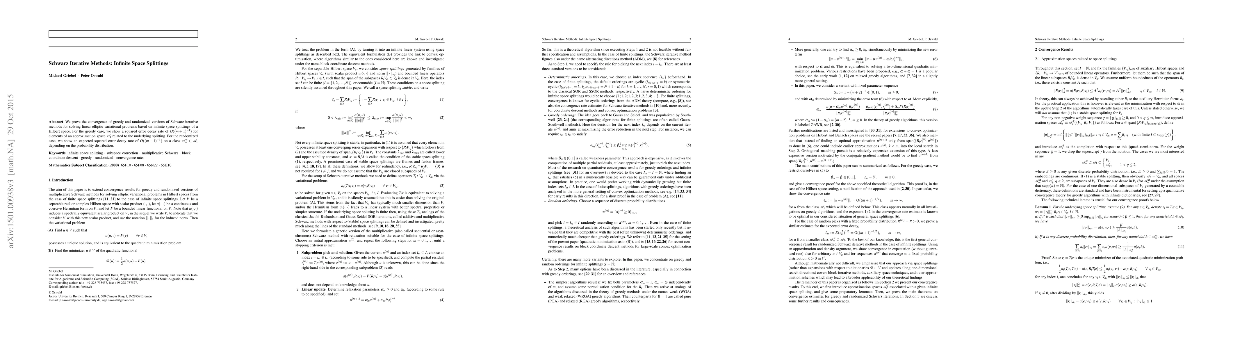 The paper proves the convergence of Schwarz iterative methods for solving linear elliptic variational problems with infinite space splittings, showing squared error decay rates of $O((m+1)^{-1})$.