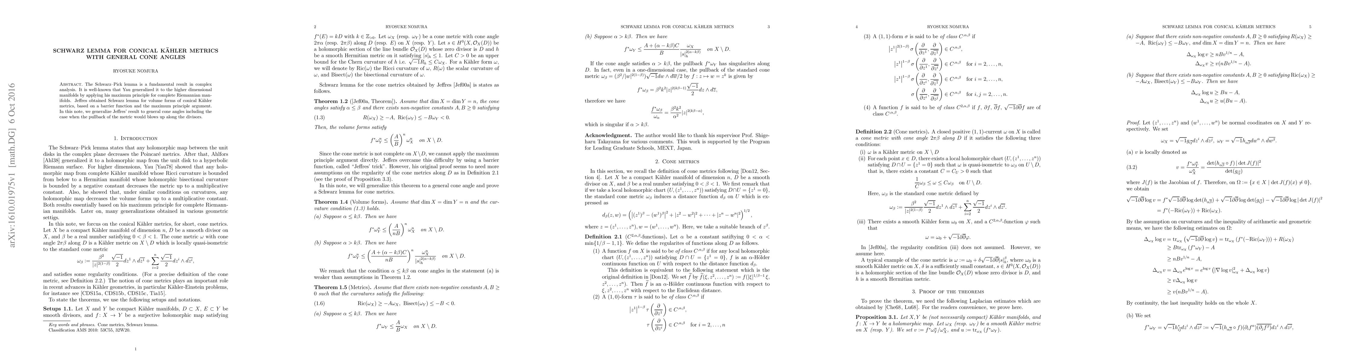 The Schwarz--Pick lemma is a fundamental result in complex analysis. It is well-known that Yau generalized it to the higher dimensional manifolds by applying his maximum principle for complete Riemannian manifolds. Jeffres obtained Schwarz lemma for volume forms of conical K\"ahler metrics, based on a barrier function and the maximum principle argument. In this note, we generalize Jeffres' result to general cone angles including the case when the pullback of the metric would blows up along the divisors.