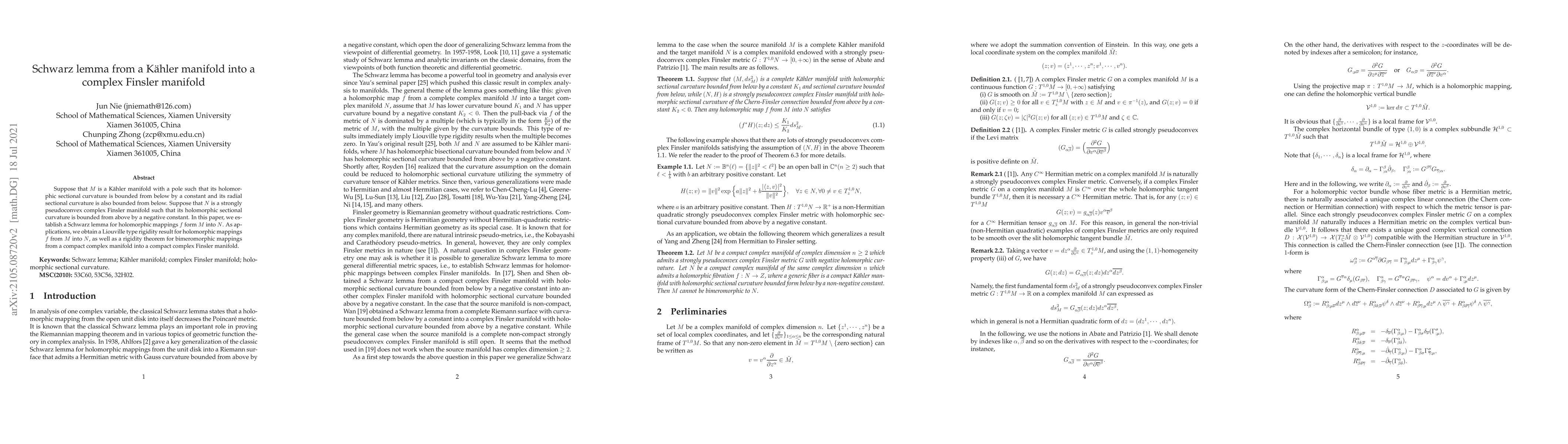 Suppose that $M$ is a K\"ahler manifold with a pole such that its holomorphic sectional curvature is bounded from below by a constant and its radial sectional curvature is also bounded from below. Suppose that $N$ is a strongly pseudoconvex complex Finsler manifold such that its holomorphic sectional curvature is bounded from above by a negative constant. In this paper, we establish a Schwarz lemma for holomorphic mappings $f$ form $M$ into $N$. As applications, we obtain a Liouville type rigidity result for holomorphic mappings $f$ from $M$ into $N$, as well as a rigidity theorem for bimeromorphic mappings from a compact complex manifold into a compact complex Finsler manifold.