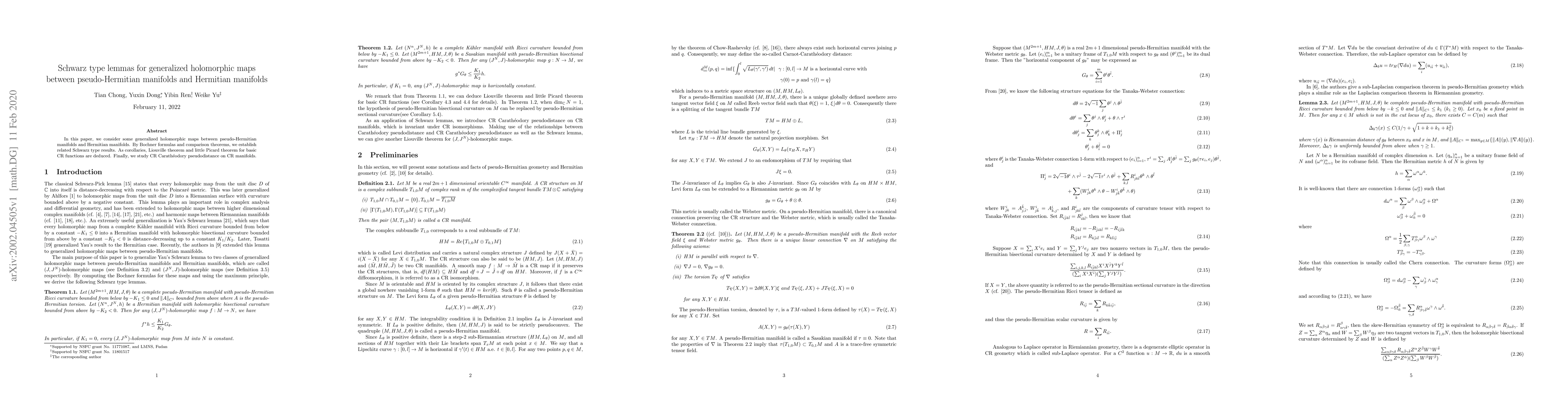 This paper establishes Schwarz type lemmas for generalized holomorphic maps between pseudo-Hermitian and Hermitian manifolds using Bochner formulas and comparison theorems. It deduces Liouville and little Picard theorems for basic CR functions and examines the CR Carathéodory pseudodistance on CR manifolds.