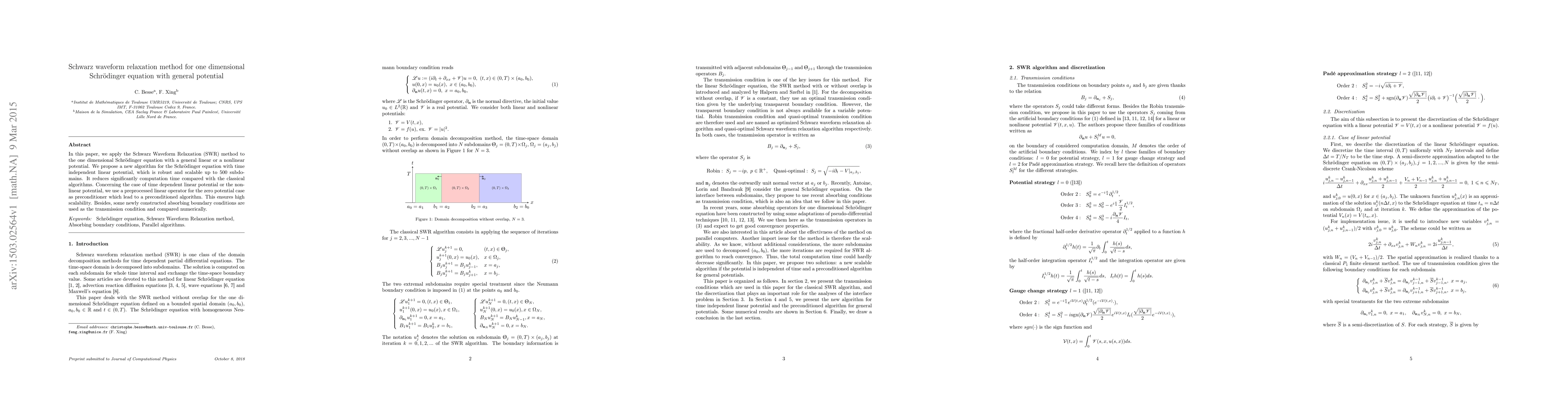 This paper applies the Schwarz Waveform Relaxation (SWR) method to solve the one-dimensional Schrödinger equation with general potentials, proposing a robust algorithm for linear potentials that scales up to 500 subdomains and significantly reduces computation time. For time-dependent potentials, a preconditioned algorithm with a preprocessed linear operator is used, ensuring high scalability.