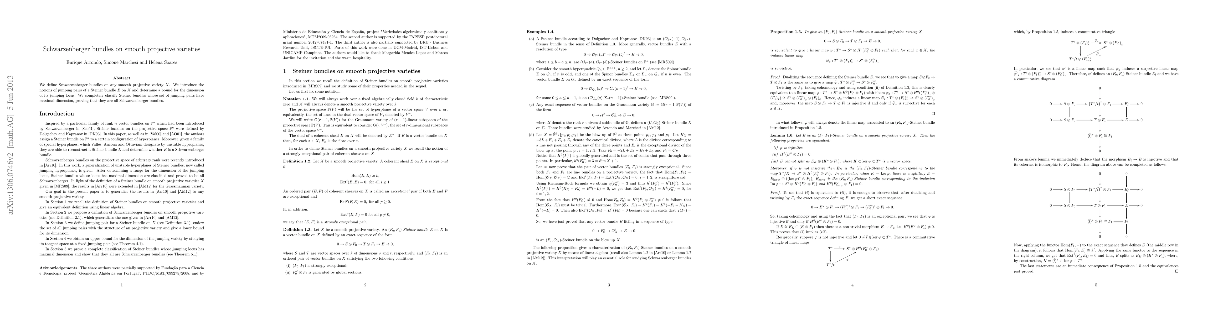 Summary: This paper defines Schwarzenberger bundles on smooth projective varieties and classifies Steiner bundles with maximal-dimensional jumping pairs, proving they are all Schwarzenberger bundles. It also determines a bound for the dimension of the jumping locus of a Steiner bundle.