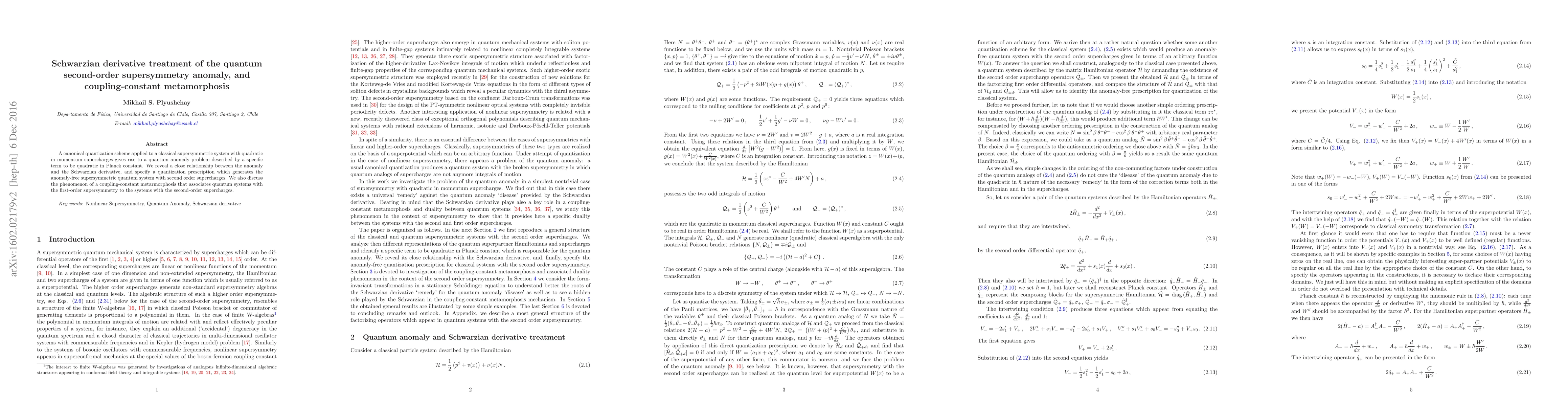 A canonical quantization scheme applied to a classical supersymmetric system with quadratic in momentum supercharges gives rise to a quantum anomaly problem described by a specific term to be quadratic in Planck constant. We reveal a close relationship between the anomaly and the Schwarzian derivative, and specify a quantization prescription which generates the anomaly-free supersymmetric quantum system with second order supercharges. We also discuss the phenomenon of a coupling-constant metarmorphosis that associates quantum systems with first-order supersymmetry to the systems with the second-order supercharges.