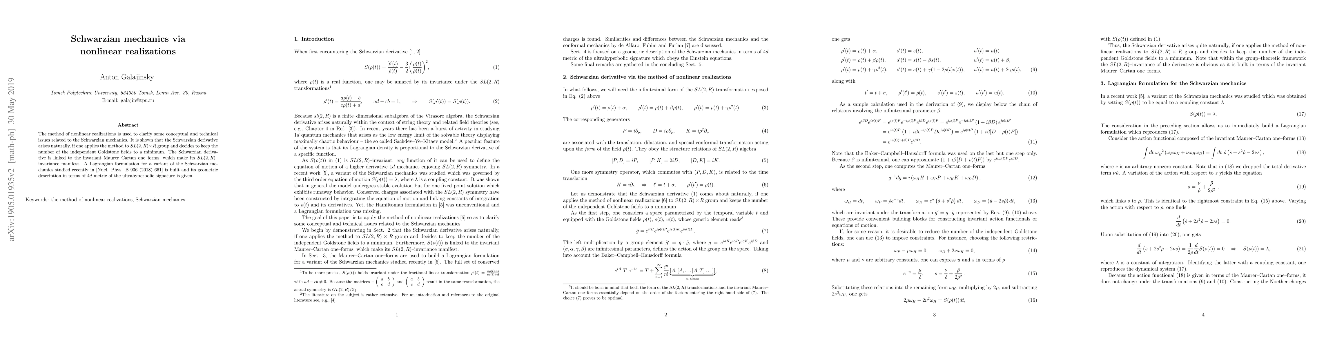 The paper employs nonlinear realizations to elucidate Schwarzian mechanics, showing the Schwarzian derivative emerges naturally when minimizing independent Goldstone fields in SL(2,R) × R transformations. It connects the Schwarzian derivative to invariant Maurer-Cartan one-forms and provides a Lagrangian for a variant of Schwarzian mechanics with a geometric description in ultrahyperbolic 4d metric.
