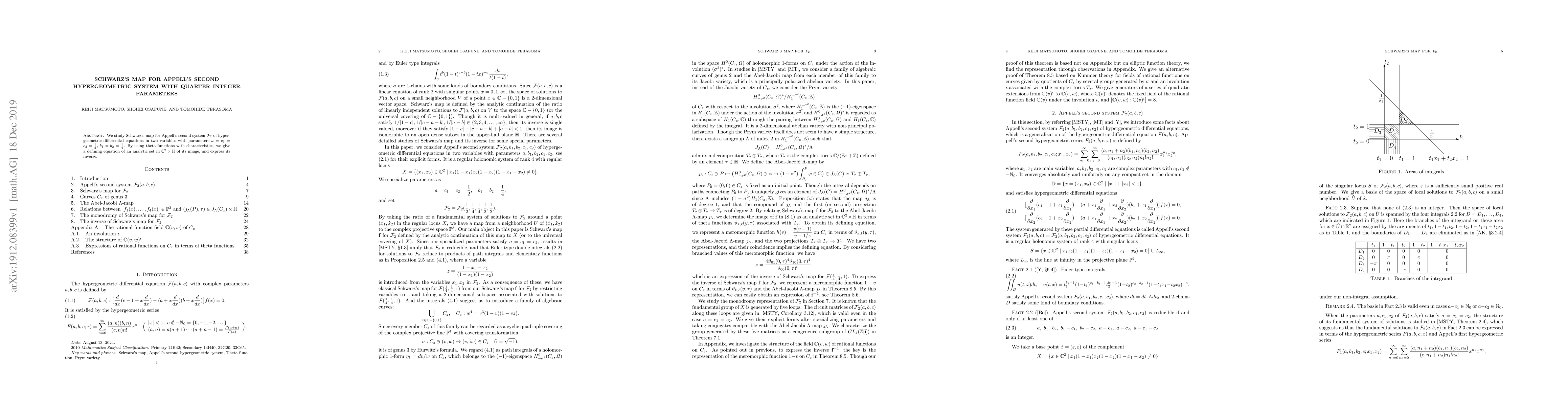 This paper explores Schwarz's map for a specific hypergeometric system with quarter-integer parameters, providing an analytic set in $ imes imes rac{1}{2}$ of its image and expressing its inverse using theta functions.