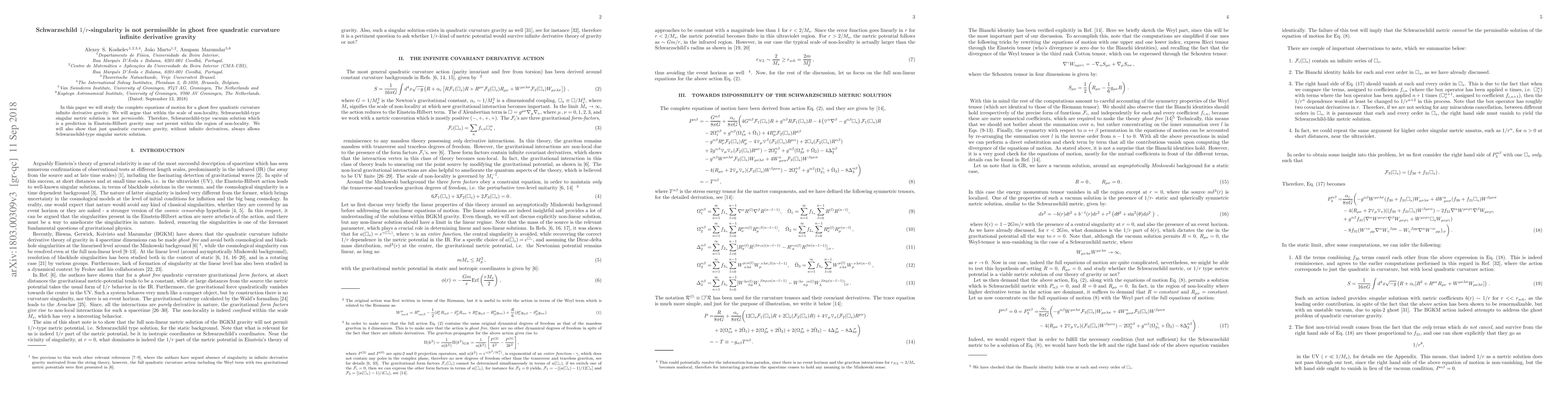This paper investigates the equations of motion for ghost-free quadratic curvature infinite derivative gravity, concluding that Schwarzschild $1/r$-singularities are not permissible within the non-locality scale, thus challenging the Schwarzschild-type vacuum solutions predicted by Einstein-Hilbert gravity. It also notes that standard quadratic curvature gravity without infinite derivatives permits such singularities.