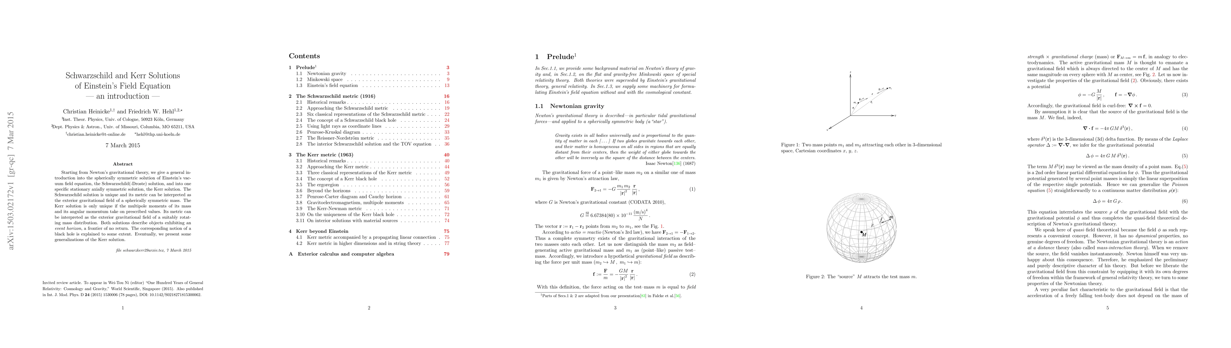 Starting from Newton's gravitational theory, we give a general introduction into the spherically symmetric solution of Einstein's vacuum field equation, the Schwarzschild(-Droste) solution, and into one specific stationary axially symmetric solution, the Kerr solution. The Schwarzschild solution is unique and its metric can be interpreted as the exterior gravitational field of a spherically symmetric mass. The Kerr solution is only unique if the multipole moments of its mass and its angular momentum take on prescribed values. Its metric can be interpreted as the exterior gravitational field of a suitably rotating mass distribution. Both solutions describe objects exhibiting an event horizon, a frontier of no return. The corresponding notion of a black hole is explained to some extent. Eventually, we present some generalizations of the Kerr solution.