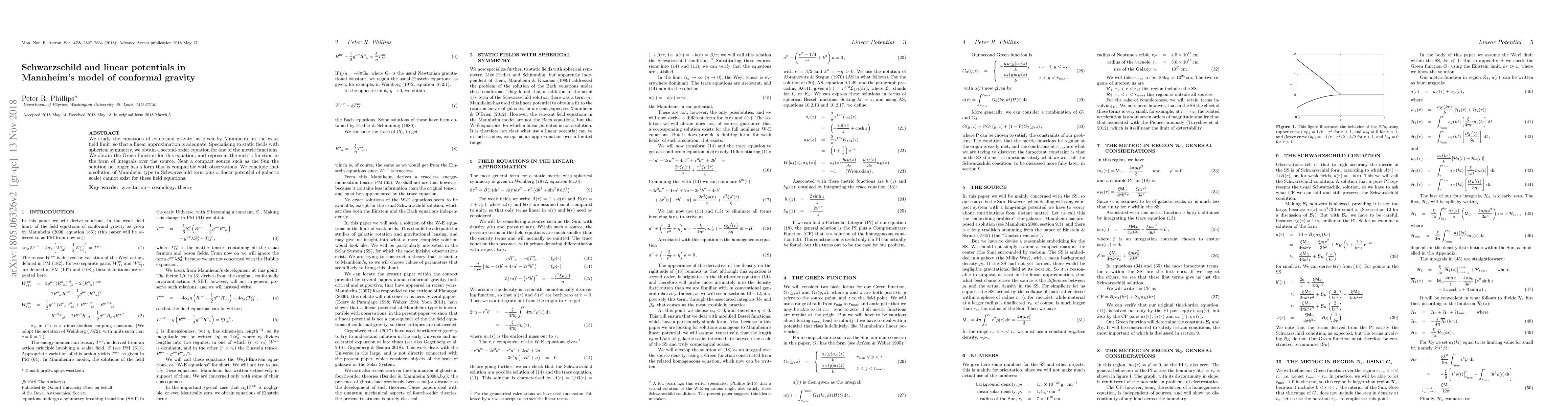 We study the equations of conformal gravity, as given by Mannheim, in the weak field limit, so that a linear approximation is adequate. Specializing to static fields with spherical symmetry, we obtain a second-order equation for one of the metric functions. We obtain the Green function for this equation, and represent the metric function in the form of integrals over the source. Near a compact source such as the Sun the solution no longer has Schwarzschild form. We conclude that a solution of Mannheim type cannot exist for these field equations.