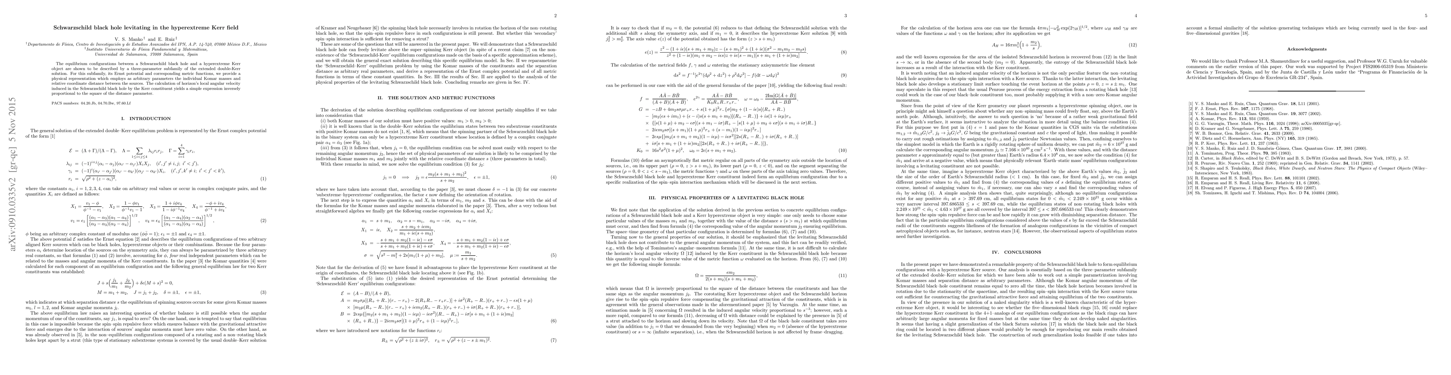 This paper explores the equilibrium configurations between a Schwarzschild black hole and a hyperextreme Kerr object, described by a three-parameter subfamily of the extended double-Kerr solution. The study provides a physical representation of the Ernst potential and metric functions using the Komar masses and relative distance, revealing a local angular velocity inversely proportional to the square of the distance parameter.