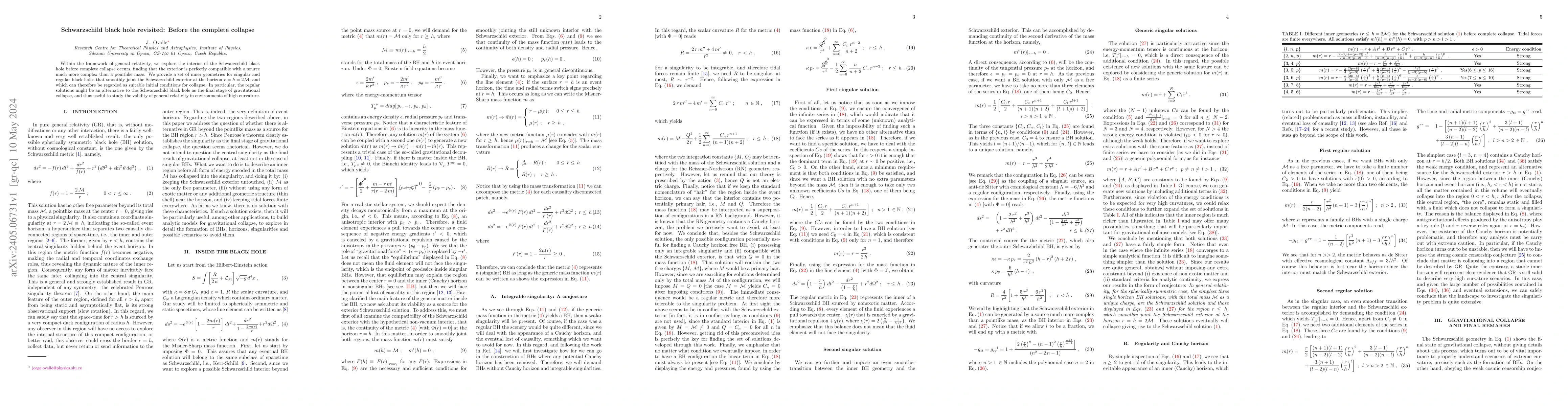This paper investigates the Schwarzschild black hole's interior prior to complete collapse, revealing that its exterior corresponds to a much more intricate source than a point mass. It proposes inner geometries for both singular and regular black holes that seamlessly connect with the Schwarzschild exterior at the horizon, suggesting regular solutions as potential alternatives to the traditional Schwarzschild black hole.