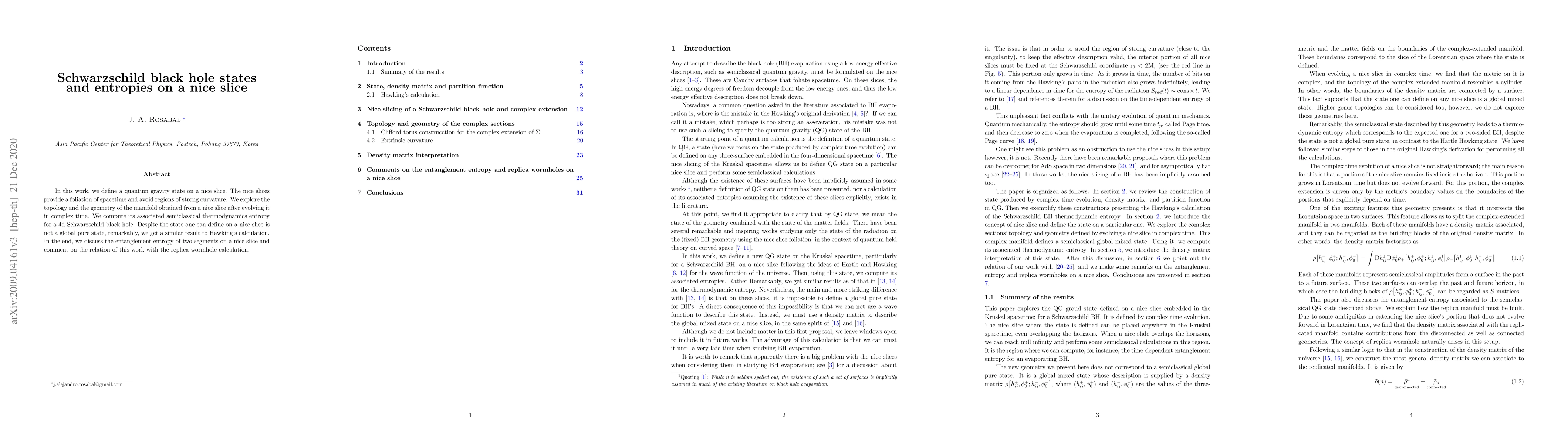In this work, we define a quantum gravity state on a nice slice. The nice slices provide a foliation of spacetime and avoid regions of strong curvature. We explore the topology and the geometry of the manifold obtained from a nice slice after evolving it in complex time. We compute its associated semiclassical thermodynamics entropy for a 4d Schwarzschild black hole. Despite the state one can define on a nice slice is not a global pure state, remarkably, we get a similar result to Hawking's calculation. In the end, we discuss the entanglement entropy of two segments on a nice slice and comment on the relation of this work with the replica wormhole calculation.