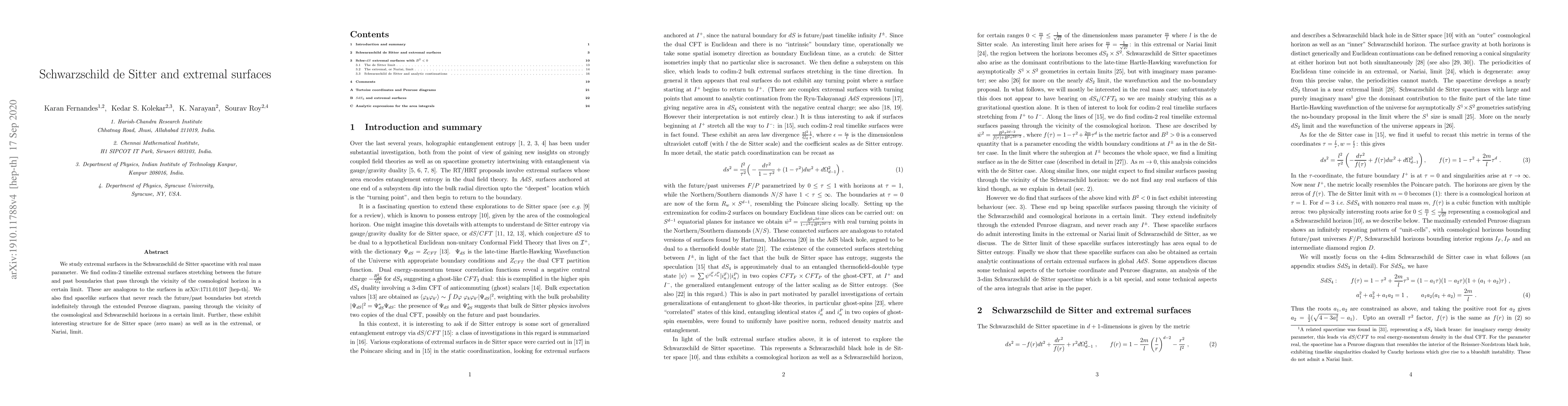 We study extremal surfaces in the Schwarzschild de Sitter spacetime with real mass parameter. We find codim-2 timelike extremal surfaces stretching between the future and past boundaries that pass through the vicinity of the cosmological horizon in a certain limit. These are analogous to the surfaces in arXiv:1711.01107 [hep-th]. We also find spacelike surfaces that never reach the future/past boundaries but stretch indefinitely through the extended Penrose diagram, passing through the vicinity of the cosmological and Schwarzschild horizons in a certain limit. Further, these exhibit interesting structure for de Sitter space (zero mass) as well as in the extremal, or Nariai, limit.
