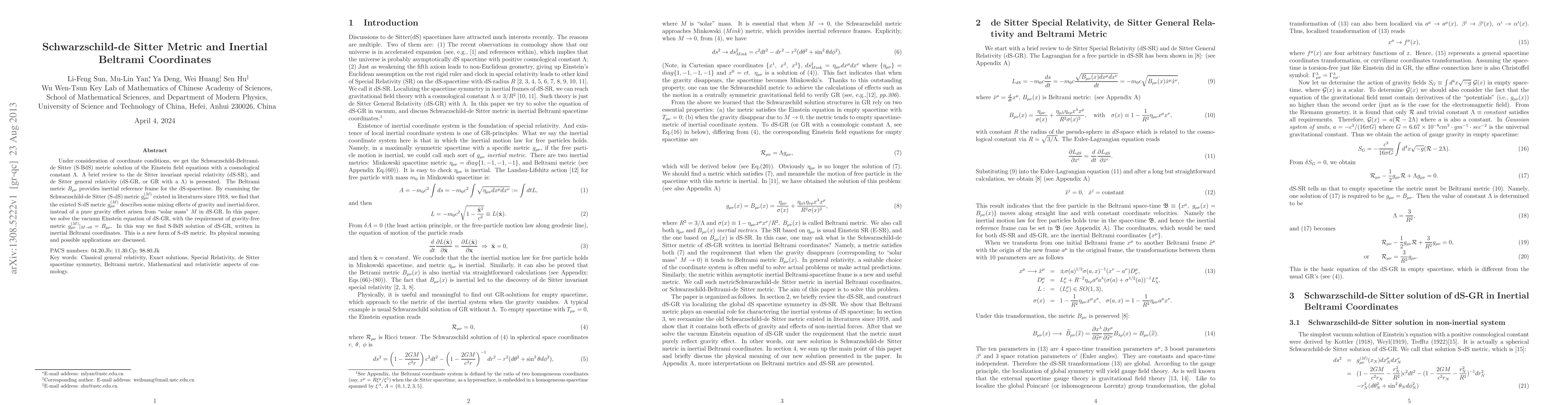 This paper derives the Schwarzschild-Beltrami-de Sitter (S-BdS) metric solution from the Einstein field equations with a cosmological constant, focusing on inertial Beltrami coordinates. It reveals that the previously known Schwarzschild-de Sitter (S-dS) metric contains mixed gravity and inertial effects, rather than pure gravitational influence, and presents a new S-BdS metric form under the condition of vanishing mass.