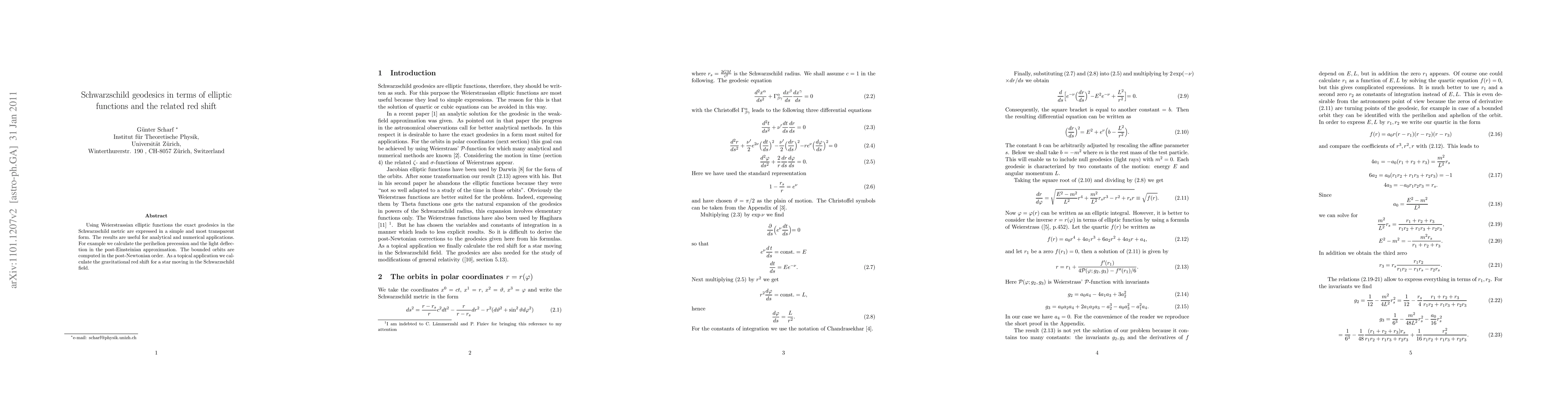 Using Weierstrassian elliptic functions the exact geodesics in the Schwarzschild metric are expressed in a simple and most transparent form. The results are useful for analytical and numerical applications. For example we calculate the perihelion precession and the light deflection in the post-Einsteinian approximation. The bounded orbits are computed in the post-Newtonian order. As a topical application we calculate the gravitational red shift for a star moving in the Schwarzschild field.