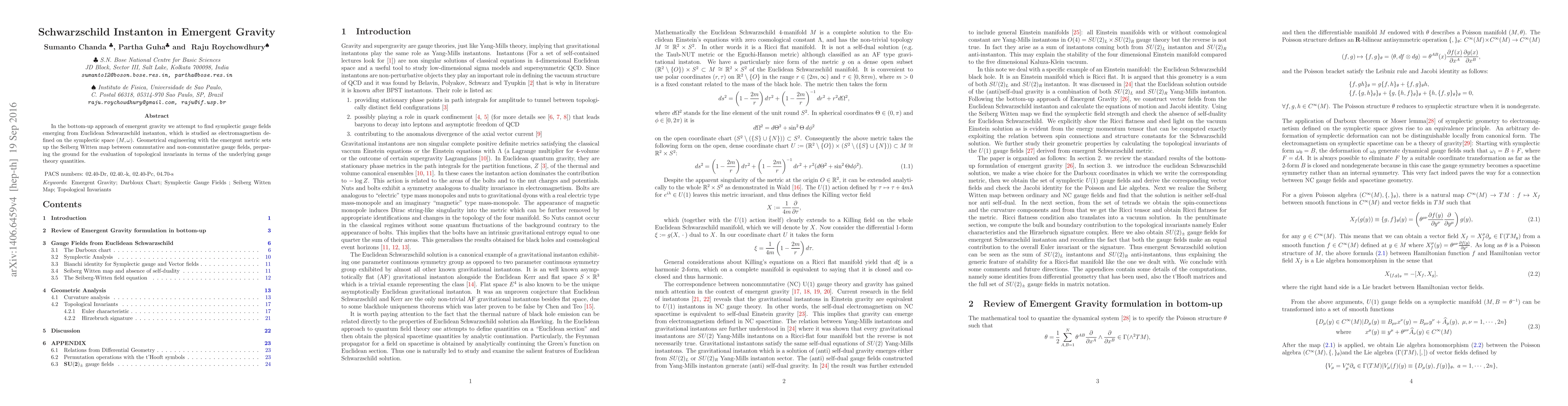 In the bottom-up approach of emergent gravity we attempt to find symplectic gauge fields emerging from Euclidean Schwarzschild instanton, which is studied as electromagnetism defined on the symplectic space $(M,\omega)$. Geometrical engineering with the emergent metric sets up the Seiberg Witten map between commutative and non-commutative gauge fields, preparing the ground for the evaluation of topological invariants in terms of the underlying gauge theory quantities.