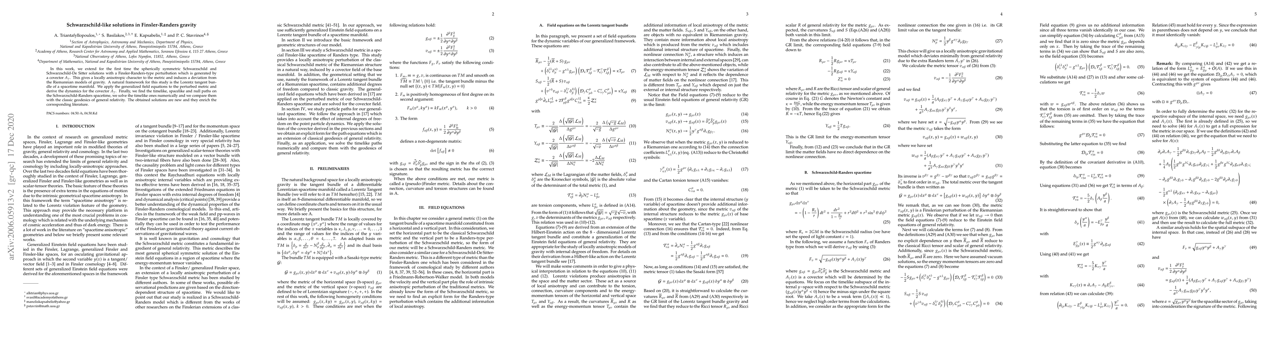 In this work, we extend for the first time the spherically symmetric Schwarzschild and Schwarzschild-De Sitter solutions with a Finsler-Randers-type perturbation which is generated by a covector $A_\gamma$. This gives a locally anisotropic character to the metric and induces a deviation from the Riemannian models of gravity. A natural framework for this study is the Lorentz tangent bundle of a spacetime manifold. We apply the generalized field equations to the perturbed metric and derive the dynamics for the covector $A_\gamma$. Finally, we find the timelike, spacelike and null paths on the Schwarzschild-Randers spacetime, we solve the timelike ones numerically and we compare them with the classic geodesics of general relativity. The obtained solutions are new and they enrich the corresponding literature.