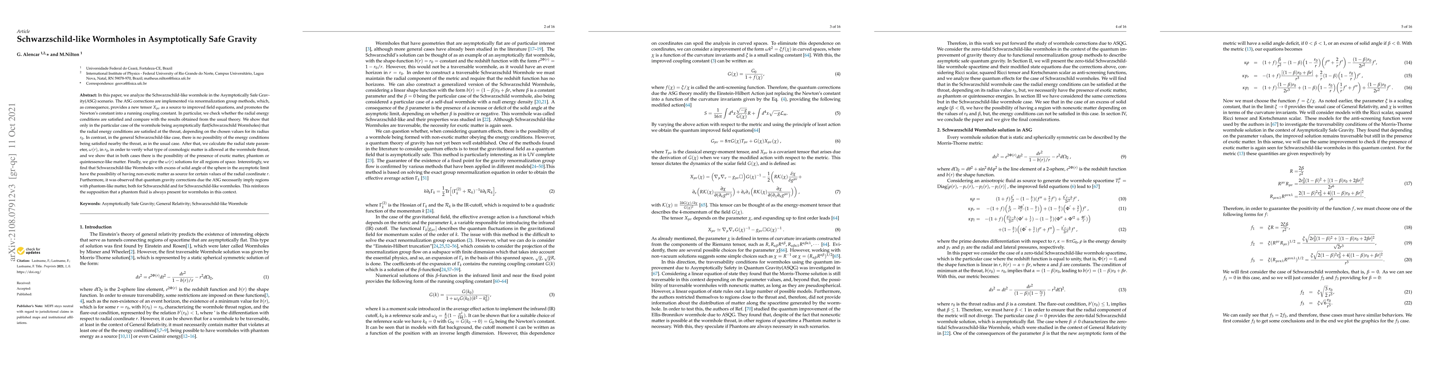 In this paper, we analyze the Schwarzschild-like wormhole in the Asymptotically Safe Gravity(ASG) scenario. The ASG corrections are implemented via renormalization group methods, which, as consequence, provides a new tensor $X_{\mu\nu}$ as a source to improved field equations, and promotes the Newton's constant into a running coupling constant. In particular, we check whether the radial energy conditions are satisfied and compare with the results obtained from the usual theory. We show that only in the particular case of the wormhole being asymptotically flat(Schwarzschild Wormholes) that the radial energy conditions are satisfied at the throat, depending on the chosen values for its radius $r_0$. In contrast, in the general Schwarzschild-like case, there is no possibility of the energy conditions being satisfied nearby the throat, as in the usual case. After that, we calculate the radial state parameter, $\omega(r)$, in $r_0$, in order to verify what type of cosmologic matter is allowed at the wormhole throat, and we show that in both cases there is the possibility of the presence of exotic matter, phantom or quintessence-like matter. Finally, we give the $\omega(r)$ solutions for all regions of space. Interestingly, we find that Schwarzschild-like Wormholes with excess of solid angle of the sphere in the asymptotic limit have the possibility of having non-exotic matter as source for certain values of the radial coordinate $r$. Furthermore, it was observed that quantum gravity corrections due the ASG necessarily imply regions with phantom-like matter, both for Schwarzschild and for Schwarzschild-like wormholes. This reinforces the supposition that a phantom fluid is always present for wormholes in this context.