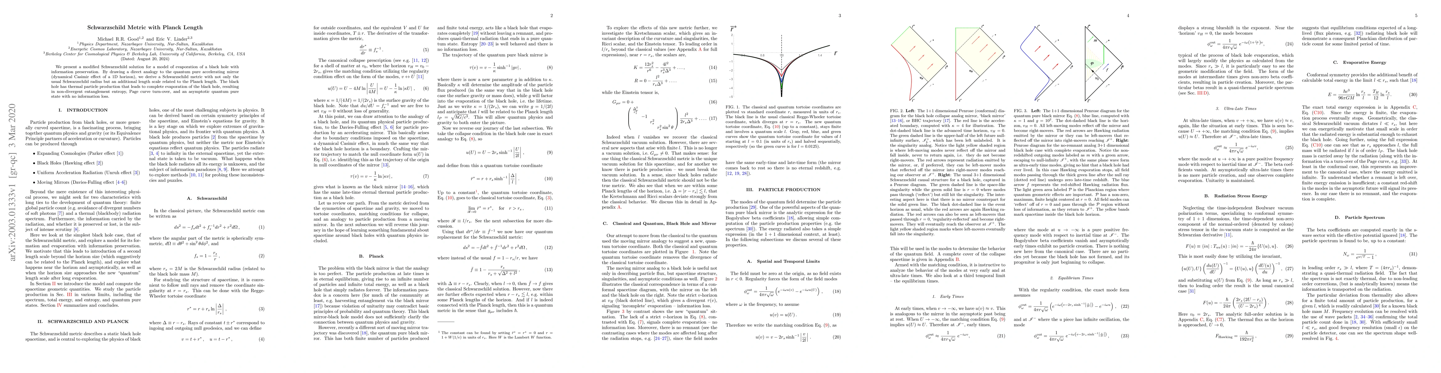 We present a modified Schwarzschild solution for a model of evaporation of a black hole with information preservation. By drawing a direct analogy to the quantum pure accelerating mirror (dynamical Casimir effect of a 1D horizon), we derive a Schwarzschild metric with not only the usual Schwarzschild radius but an additional length scale related to the Planck length. The black hole has thermal particle production that leads to complete evaporation of the black hole, resulting in non-divergent entanglement entropy, Page curve turn-over, and an asymptotic quantum pure state with no information loss.