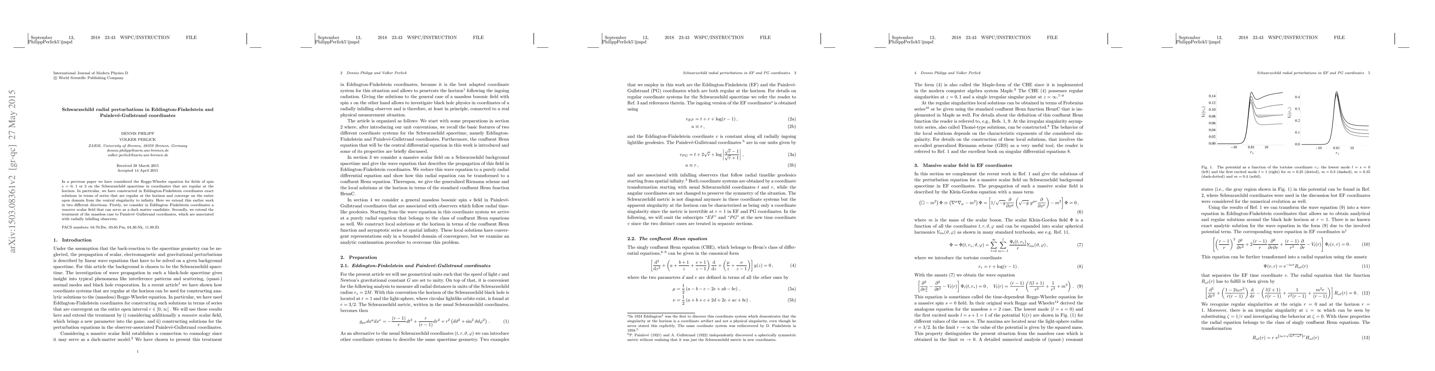 This paper extends previous work on Schwarzschild radial perturbations by solving the Regge-Wheeler equation for spin $s=0$, $1$, and $2$ fields in Eddington-Finkelstein coordinates, introducing a massive scalar field as a dark matter candidate and extending the analysis to Painlevé-Gullstrand coordinates for radially infalling observers.