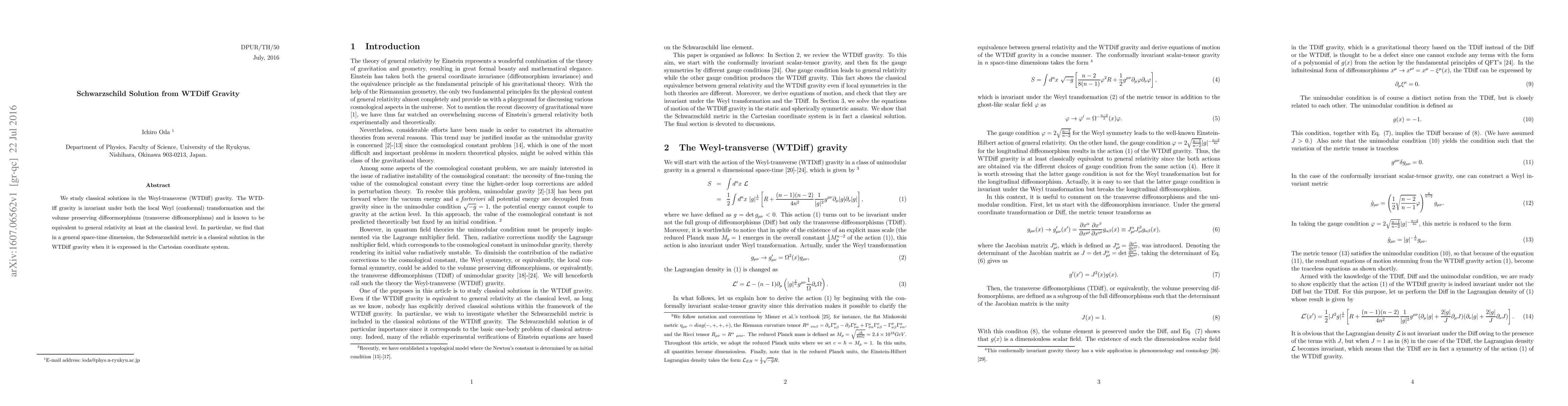 Researchers found that the Schwarzschild metric is a solution to WTDiff gravity in a general space-time dimension, demonstrating equivalence with general relativity at the classical level.