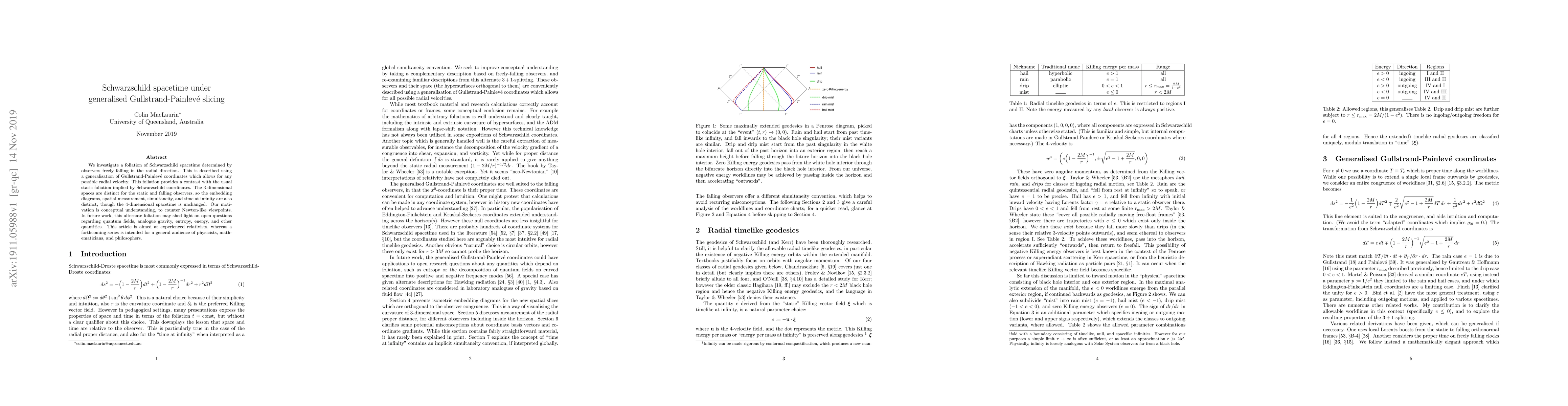 We investigate a foliation of Schwarzschild spacetime determined by observers freely falling in the radial direction. This is described using a generalisation of Gullstrand-Painlev\'e coordinates which allows for any possible radial velocity. This foliation provides a contrast with the usual static foliation implied by Schwarzschild coordinates. The $3$-dimensional spaces are distinct for the static and falling observers, so the embedding diagrams, spatial measurement, simultaneity, and time at infinity are also distinct, though the $4$-dimensional spacetime is unchanged. Our motivation is conceptual understanding, to counter Newton-like viewpoints. In future work, this alternate foliation may shed light on open questions regarding quantum fields, analogue gravity, entropy, energy, and other quantities. This article is aimed at experienced relativists, whereas a forthcoming series is intended for a general audience of physicists, mathematicians, and philosophers.