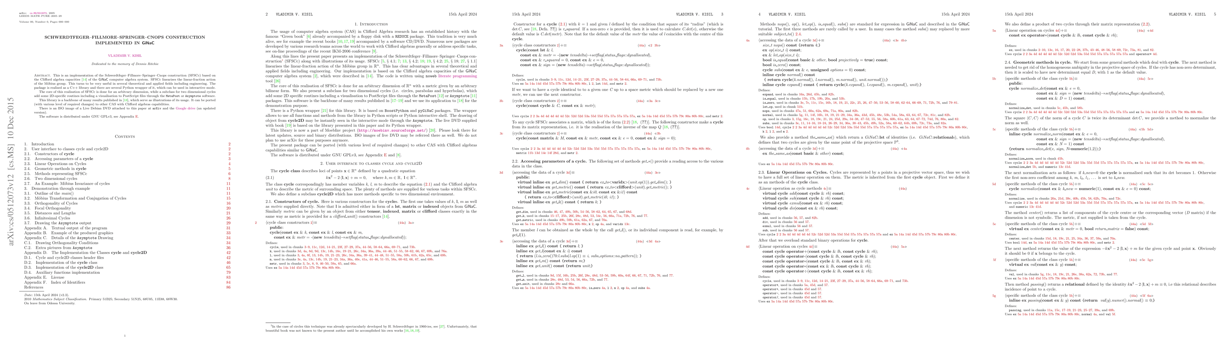This paper presents an implementation of the Schwerdtfeger-Fillmore-Springer-Cnops construction (SFSCc) along with illustrations of its usage. SFSCc linearises the linear-fraction action of the Moebius group in R^n. This has clear advantages in several theoretical and applied fields including engineering. Our implementation is based on the Clifford algebra capacities of the GiNaC computer algebra system (http://www.ginac.de/), which were described in cs.MS/0410044. The core of this realisation of SFSCc is done for an arbitrary dimension of R^n with a metric given by an arbitrary bilinear form. We also present a subclass for two dimensional cycles (i.e. circles, parabolas and hyperbolas), which add some 2D specific routines including a visualisation to PostScript files through the MetaPost (http://www.tug.org/metapost.html) or Asymptote (http://asymptote.sourceforge.net/) packages. This software is the backbone of many results published in math.CV/0512416 and we use its applications their for demonstration. The library can be ported (with various level of required changes) to other CAS with Clifford algebras capabilities similar to GiNaC. There is an ISO image of a Live Debian DVD attached to this paper as an auxiliary file, a copy is stored on Google Drive as well.