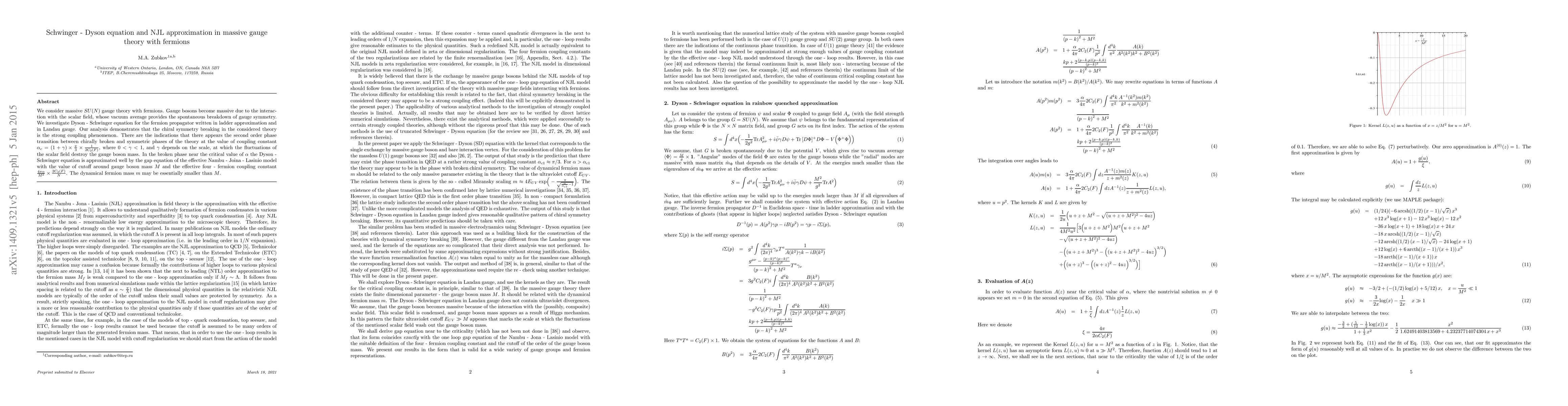 This paper examines massive $SU(N)$ gauge theory with fermions, focusing on the Schwinger-Dyson equation and the NJL approximation. It finds that chiral symmetry breaking is a strong coupling phenomenon, suggesting a second-order phase transition at a critical coupling constant value, with the theory's behavior near this point approximated by the NJL model.