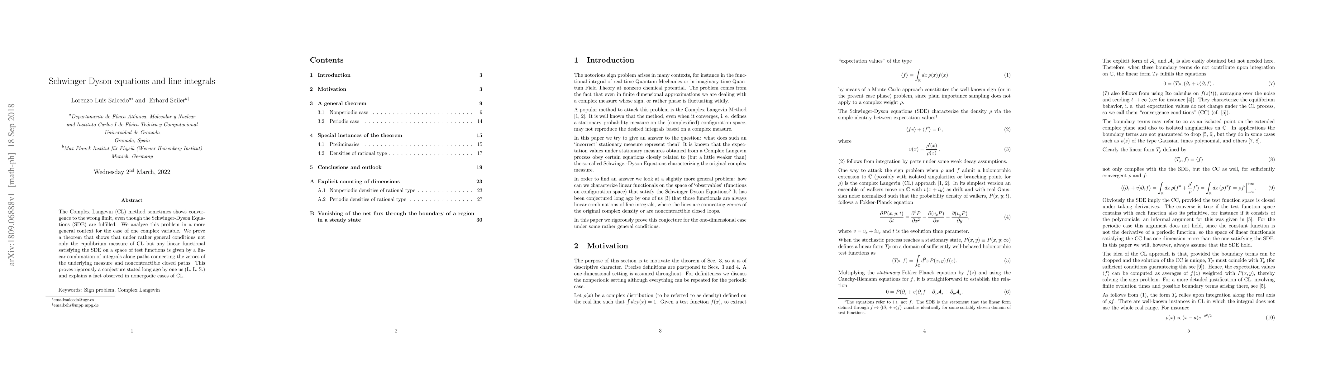 The Complex Langevin (CL) method sometimes shows convergence to the wrong limit, even though the Schwinger-Dyson Equations (SDE) are fulfilled. We analyze this problem in a more general context for the case of one complex variable. We prove a theorem that shows that under rather general conditions not only the equilibrium measure of CL but any linear functional satisfying the SDE on a space of test functions is given by a linear combination of integrals along paths connecting the zeroes of the underlying measure and noncontractible closed paths. This proves rigorously a conjecture stated long ago by one us (L.~L.~S.) and explains a fact observed in nonergodic cases of CL. one us (L.~L.~S.) and explains a fact observed in nonergodic cases of CL.