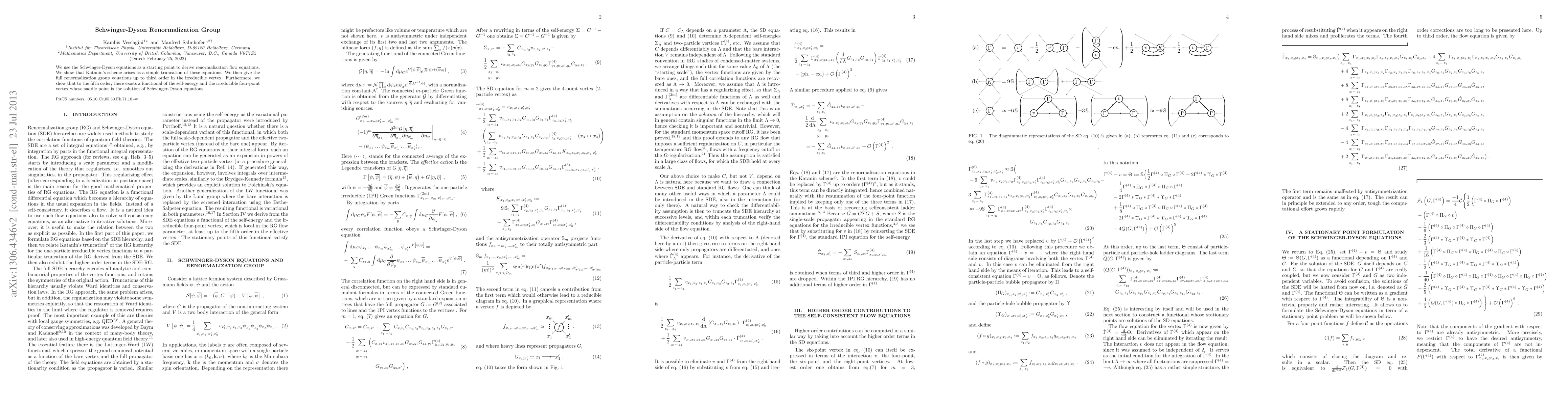 We use the Schwinger-Dyson equations as a starting point to derive renormalization flow equations. We show that Katanin's scheme arises as a simple truncation of these equations. We then give the full renormalization group equations up to third order in the irreducible vertex. Furthermore, we show that to the fifth order, there exists a functional of the self-energy and the irreducible four-point vertex whose saddle point is the solution of Schwinger-Dyson equations.