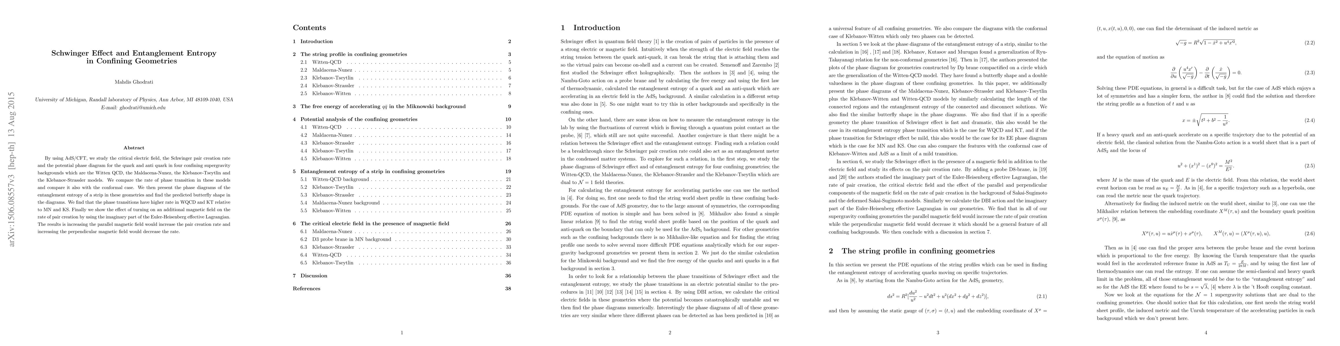 This paper uses AdS/CFT to analyze the Schwinger pair creation rate and phase transitions in four confining supergravity models, finding higher transition rates in Witten QCD and Klebanov-Tseytlin compared to others. It also examines entanglement entropy phase diagrams, revealing a butterfly shape, and shows that magnetic fields affect pair creation rates differently depending on their orientation.